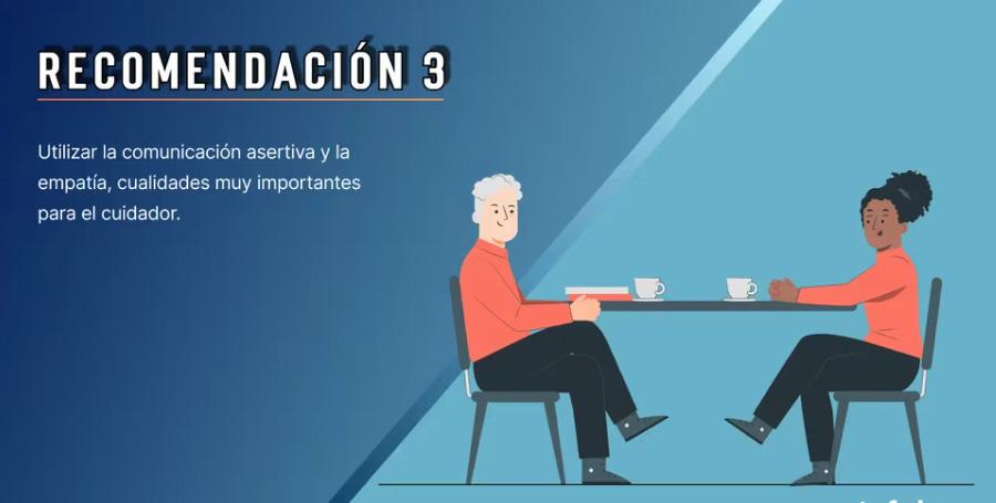 En ese sentido, tanto la comunicación asertiva como la empatía son habilidades muy importantes para el cuidador a la hora de acompañar al adulto mayor. Es necesario comprender que en algunos casos puede ser muy difícil para las personas mayores transitar el envejecimiento, ya sea por ver sus propias limitaciones físicas o cognitivas, por depender de un otro para llevar a cabo tareas habituales, por sentirse una carga para su familia, por el miedo a las enfermedades propias de la edad o la vulnerabilidad ante otras, así como también la angustia ante la pérdida de sus pares.