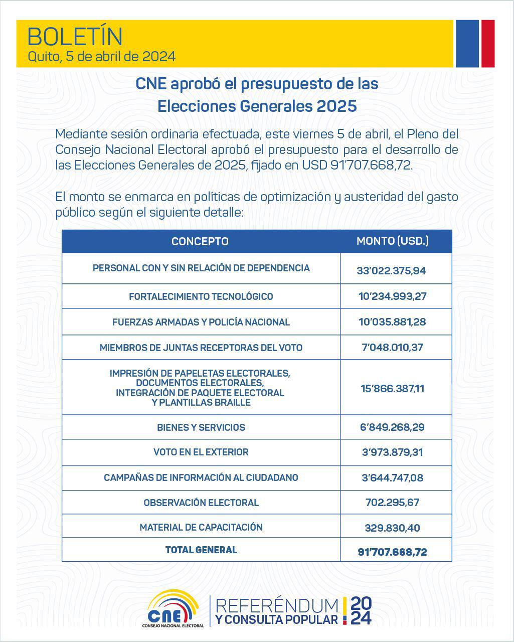 Según la resolución cada opción (Sí o No), recibirá $204.814,37 para la promoción. La campaña electoral se realizará del 7 al 18 de abril, tomando en cuenta que el sufragio se realizará el próximo domingo 21 de abril de 2024, según el calendario electoral.