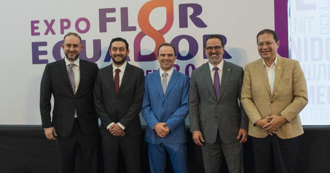 (De izquierda a derecha) Alejandro Martínez, presidente ejecutivo de Expoflores; Daniel Legarda, viceministerio de Comercio Exterior del Ministerio de Producción; Comercio Exterior, Inversio nes y Pesca; Guillermo Bustamante, presidente del Directorio de Expoflores, Gustavo Manrique, ministro de Ambiente, Agua y Transición Ecológica y Santiago Guarderas, alcalde de Quito.