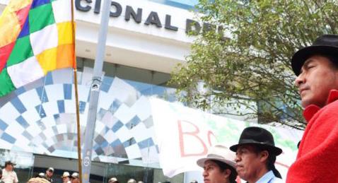 Frente a la sede de la Corte Constitucional, las organizaciones indígenas y los colectivos antimineros realizaron un plantón para exigir la anulación del Decreto 754, cuya aplicación para destrabar varios proyectos mineros causó meses atrás una serie de protestas donde se registraron enfrentamientos entre Policía y manifestantes.