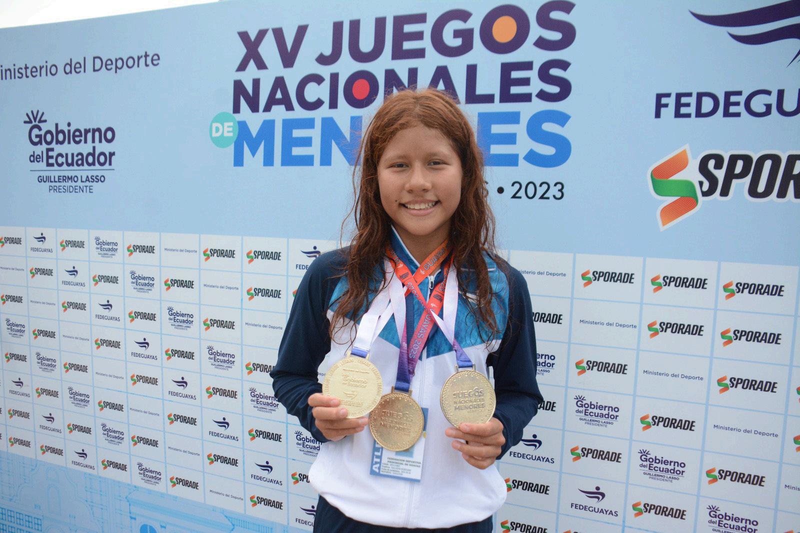 “Como pez en el agua” así se sintió la deportista de la provincia de Guayas Anahy Salazar, al colgarse tres medallas de oro en el inicio de la natación de los Juegos Nacionales de Menores Guayas 2023.