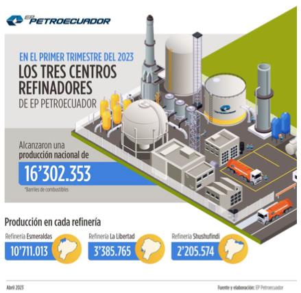 Los tres centros refinadores de EP Petroecuador, en el primer trimestre del 2023, alcanzaron una producción nacional de 16’302.353,63 barriles de combustibles.
