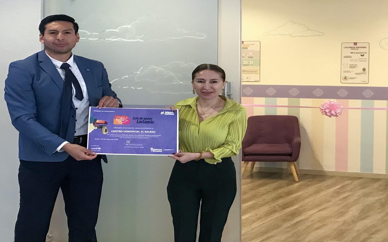 Ciudad Comercial El Recreo inauguró la primera Sala de Lactancia Materna, con el objetivo de brindar un espacio adecuado para la correcta alimentación de los más pequeños y lograr una infancia plena. El evento se realizó el 1 de junio, día dónde se celebra a la niñez ecuatoriana, contó con la participación de Andrés Gómez, encargado de la alimentación y nutrición de la coordinación zonal 9 de salud, Valeria Obando doctora distrital 17D06 de salud quienes hicieron la entrega del certificado de apoyo a la Lactancia a el Centro Comercial representado por Marianela Berrazueta, Administradora de El Recreo.