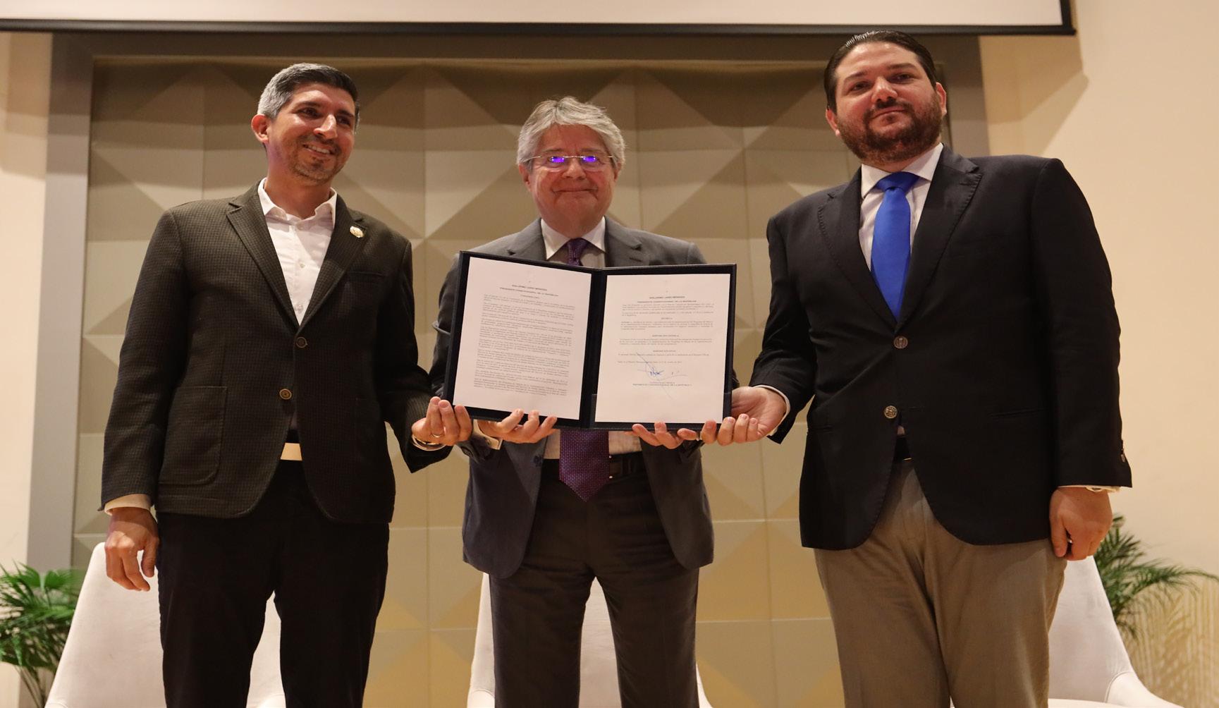 Suscribieron el convenio la Gerente General Subrogante, Ing. Paola Aguilar y el Alcalde de Colimes, Alex Quinto; como testigo de honor firmó el Presidente del Directorio del banco público, Mauricio Salem.