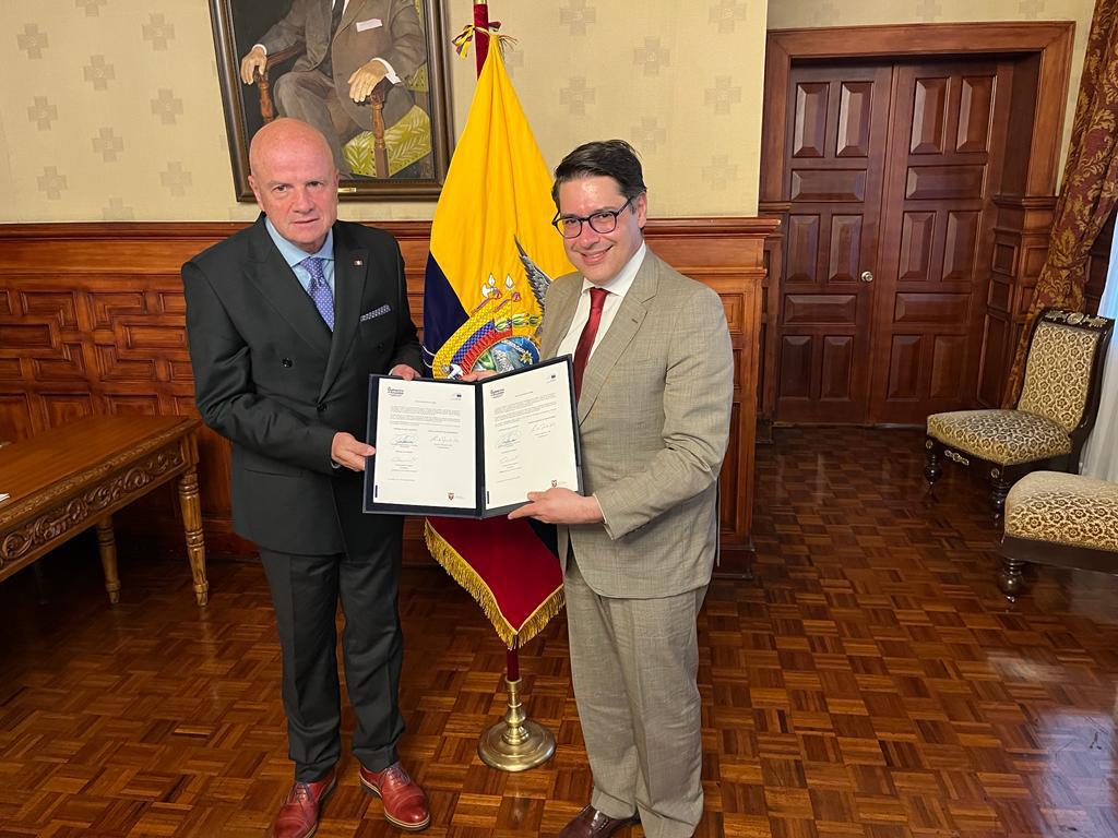 Ricardo Mourinho Felix, Vicepresidente del Banco Europeo de Inversiones firmó en presencia de Alfredo Borrero, Vicepresidente de Ecuador, un préstamo de USD 100 millones para apoyar la campaña de vacunación pediátrica de Ecuador y cubrir la compra de vacunas.