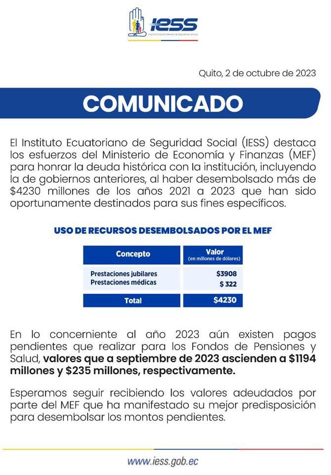 El Instituto Ecuatoriano de Seguridad Social (IESS) resaltó el "pago de la deuda histórica" con la institución, incluyendo la de gobiernos anteriores. Esto, por el desembolso de más de USD 4.230 millones de los años 2021 a 2023, por parte del Ministerio de Economía y Finanzas.