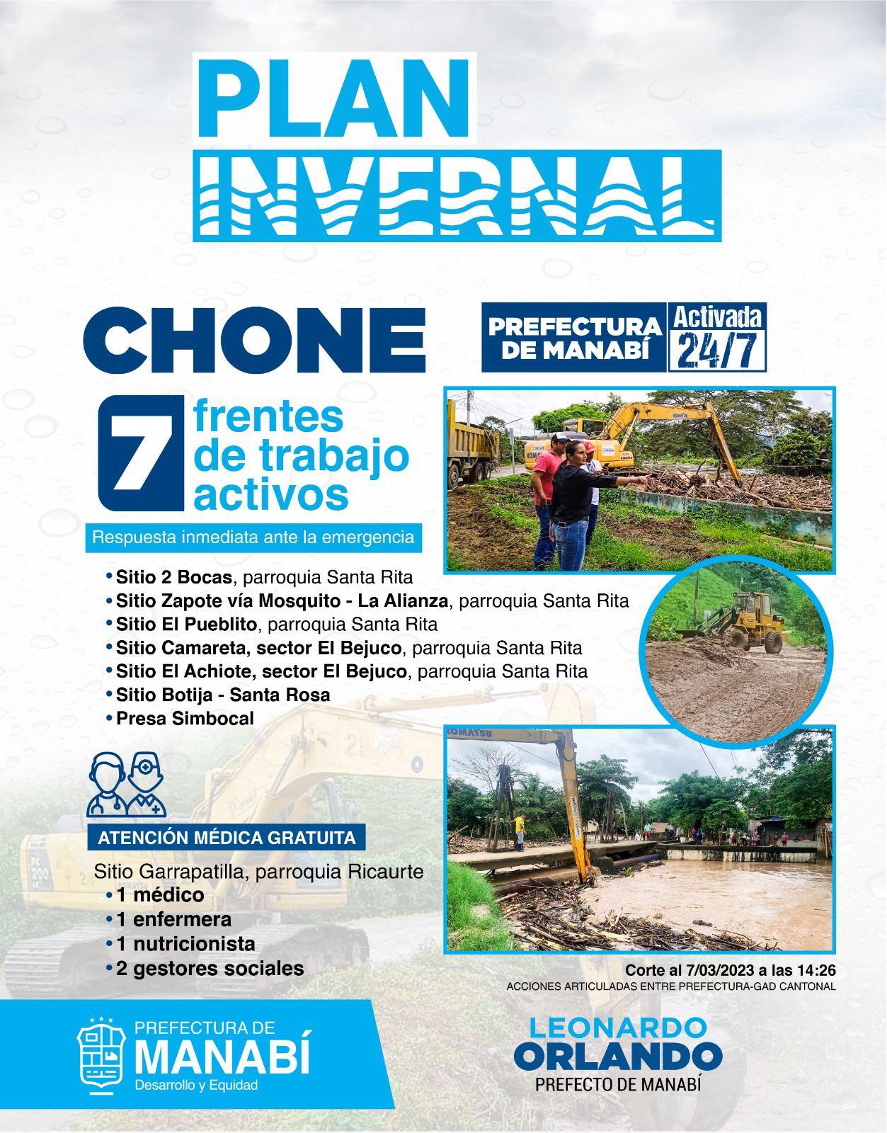 La Prefectura de Manabí ha desplegado una respuesta inmediata en el cantón Chone que ha sido fuertemente afectado por las torrenciales lluvias de las últimas horas.