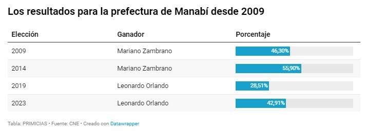 Manabí ha sido, históricamente, un bastión correísta. Hace una década, Alianza PAIS era aliada del prefecto Mariano Zambrano, con su movimiento Unidad Primero, y juntos se mantuvieron en la mayoría de alcaldías y la prefectura en 2009 y 2014.