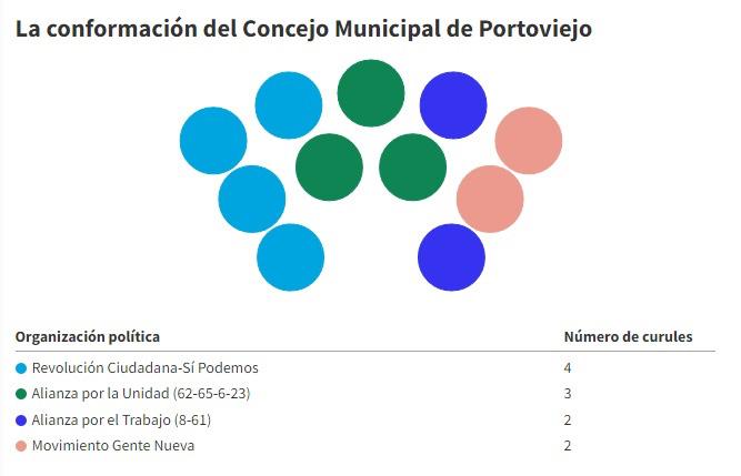 El Concejo de Portoviejo tiene 11 concejales, que se dividirán entre cuatro fuerzas políticas. Revolución Ciudadana se lleva cuatro cu-