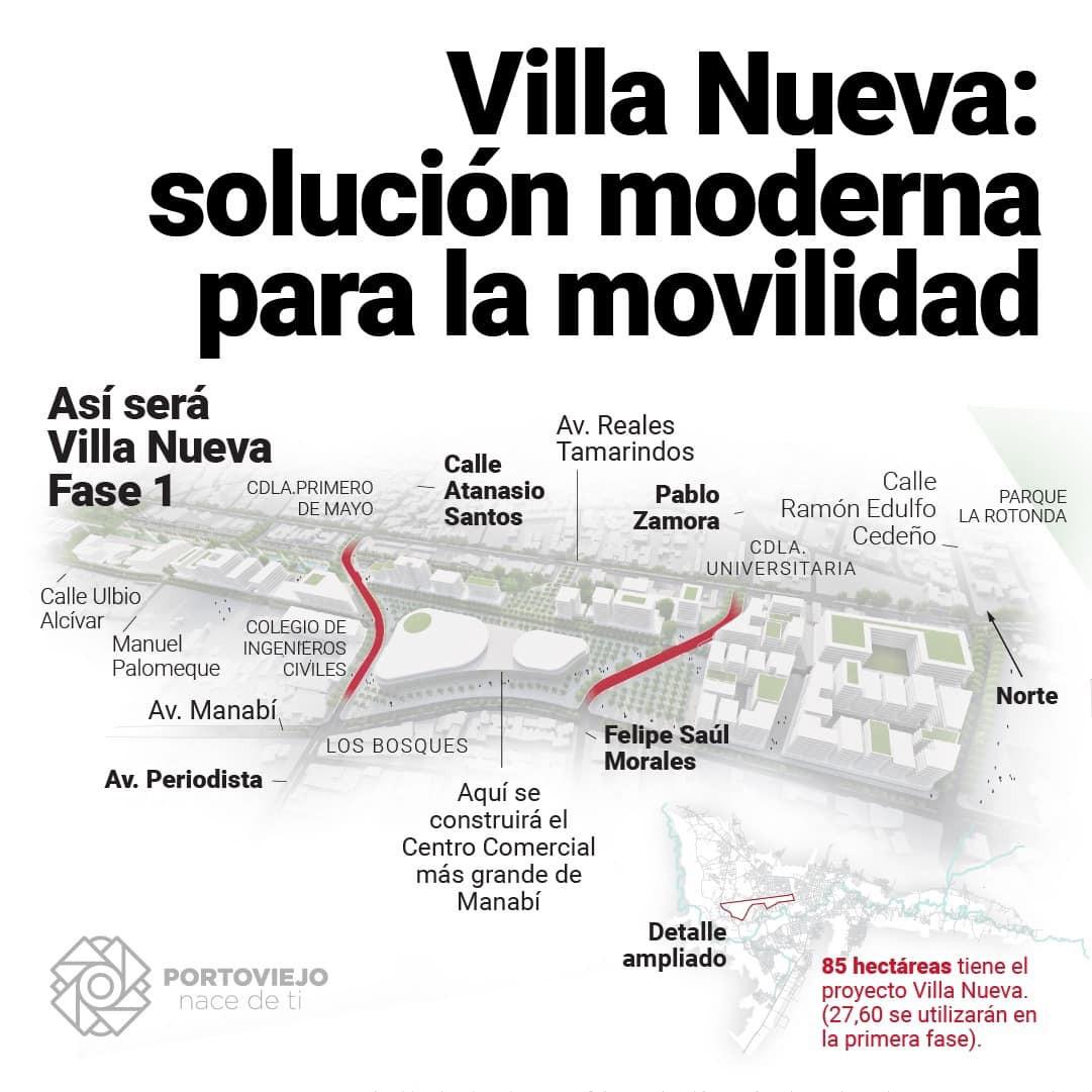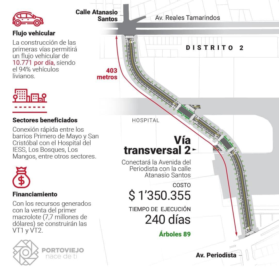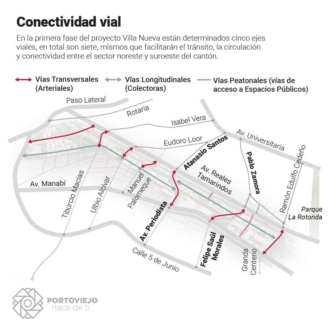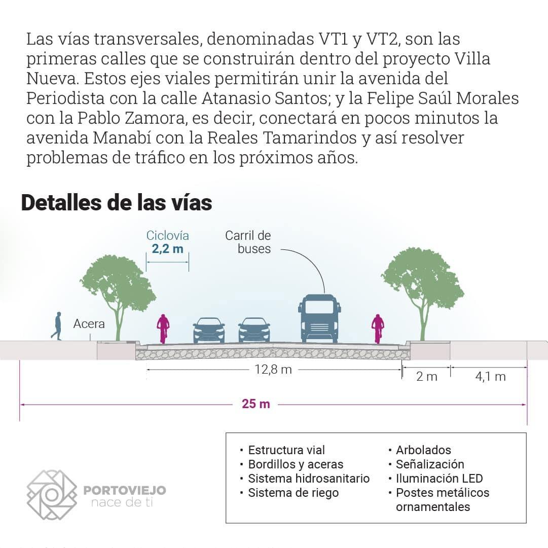 Las vías transversales denominadas VT1 y VT2 son las primeras calles que se construirán dentro del proyecto Villa Nueva. En el caso de la VT1, permitirá unir la calle Felipe Saúl Morales con la Pablo Zamora; la VT2 unirá la avenida del Periodista con la calle Atanasio Santos; es decir, se conectará en pocos minutos la avenida Manabí con la Reales Tamarindos y así se resolverá problemas de tránsito en los próximos años. Félix Jaime, subdirector municipal de Planificación Urbanística y Ordenamiento Territorial, explicó que ambas vías tendrán 25 metros de ancho con carpeta asfáltica, bordillos, aceras, sistema hidrosanitario, sistema de riego, arborización, señalización, iluminación LED, postes metálicos ornamentales, parqueos, entre otras características.