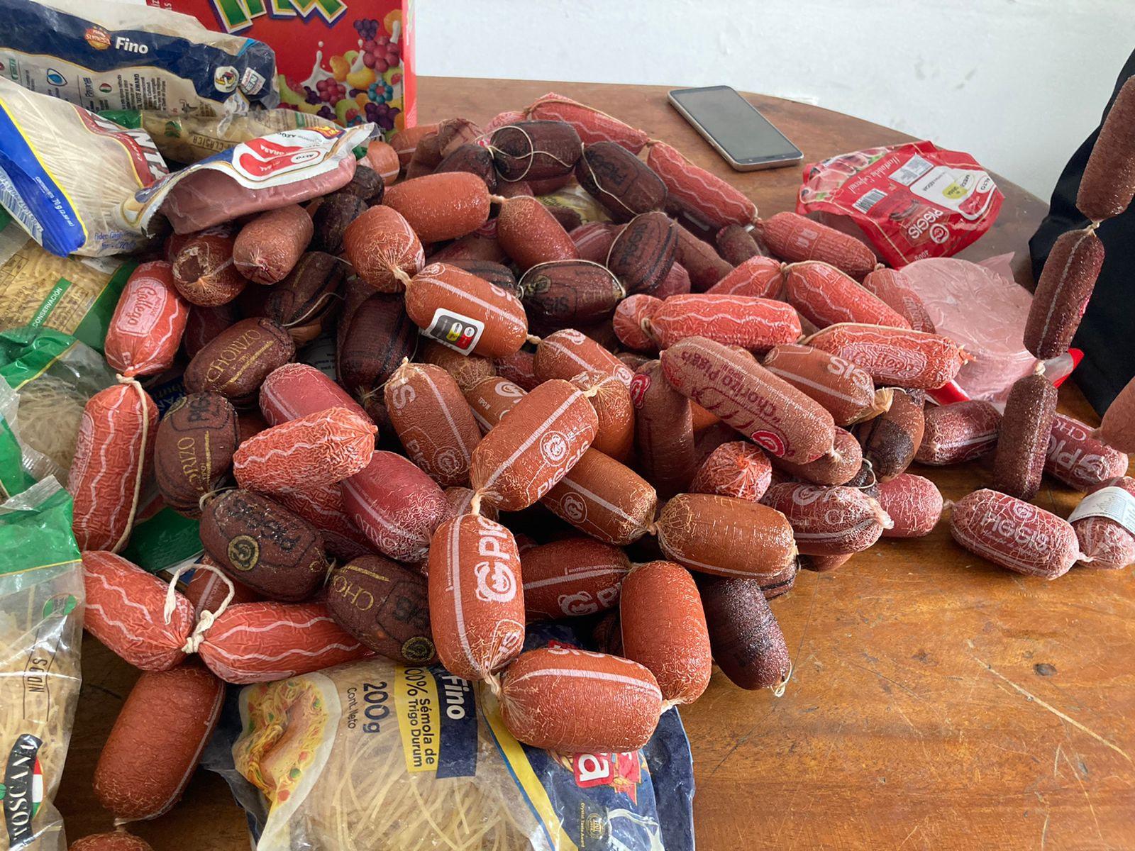 Entre los productos caducados se encon traron en exhibición; 148 chorizos embuti dos, 4 paquetes de mortadela, 79 fundas de fideo, 2 fundas de maíz canguil, 11 envases de salsa de tomate, 3 envases de 50 gramos de salsa de ají, 2 envases de vinagre, 6 tarri nas de lava vajilla de 250 gramos, 1 man