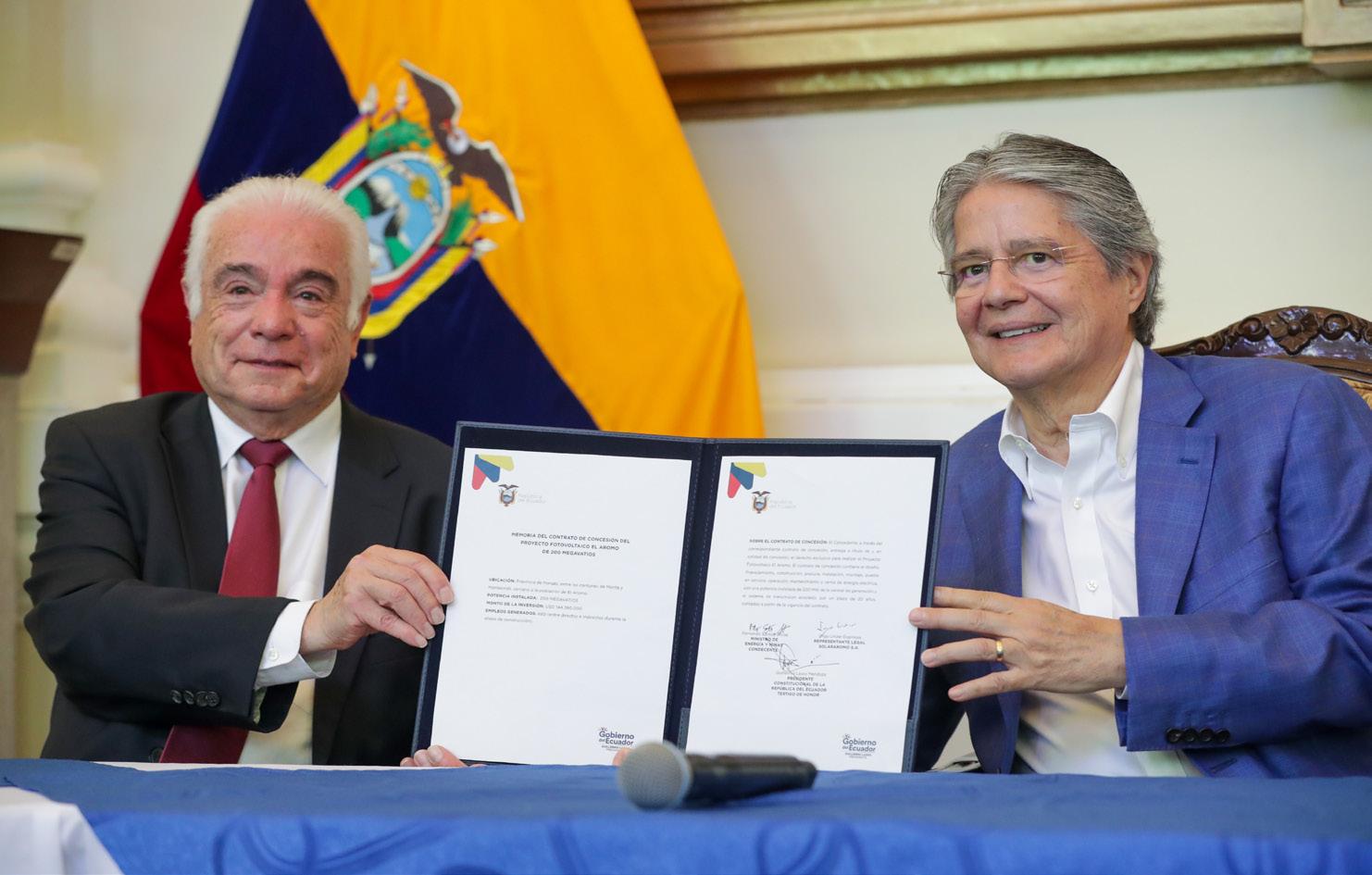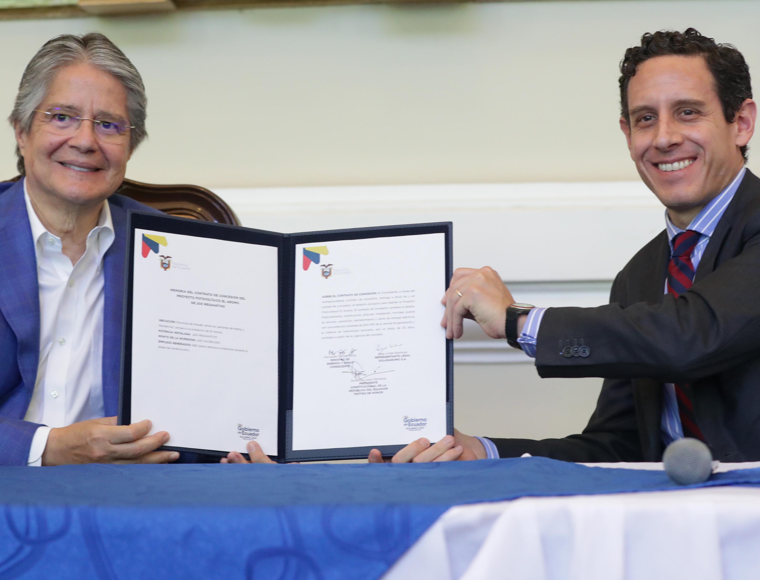 Este 3 de marzo, el presidente Guillermo Lasso Mendoza lideró la suscripción de la concesión del proyecto fotovoltaico El Aromo a la empresa Solarpack. Con ello, se dará inicio a la primera obra de generación eléctrica renovable y limpia del país, la cual tendrá una inversión de casi USD 145 millones. “¡Con El Aromo contribuimos a la transición energética, así como lo hacen los proyectos fotovoltaicos y eólicos de ́Galápagos y Loja!”, enfatizó el Presidente.