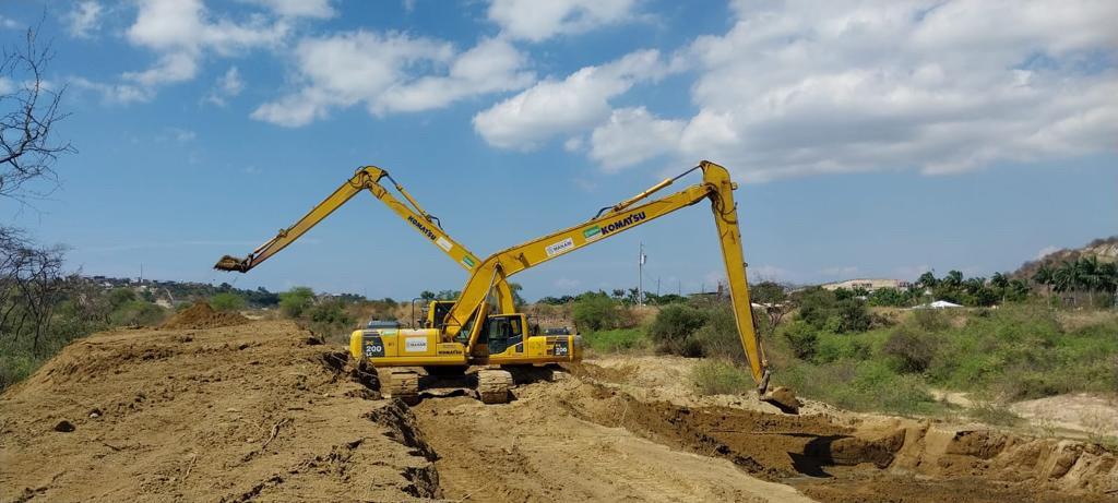 Dos excavadoras brazos largos de la dirección de Riego y Drenaje de la Prefectura de Manabí, realiza la limpieza, desazolve y reconformación del río Manta, por el sector
