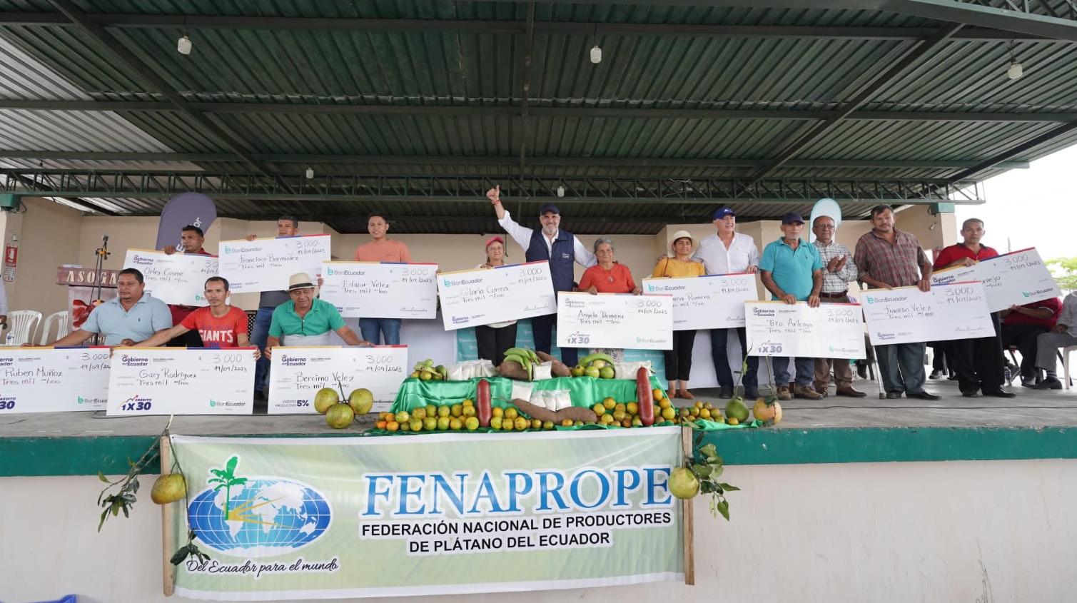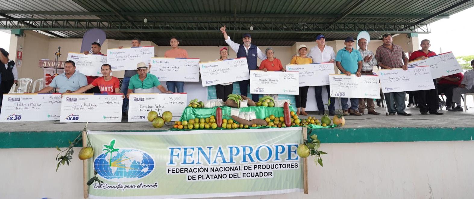 “Nos hemos volcado a cambiar el rostro del banco de la mano de las organizaciones quienes están más cerca de la gente y conocen sus necesidades”, dijo Salem. Durante el evento, pequeños productores de plátano barraganete de exportación, recibieron créditos 1x30 por parte del banco público, para financiar labores de campo como abono y fertilización.