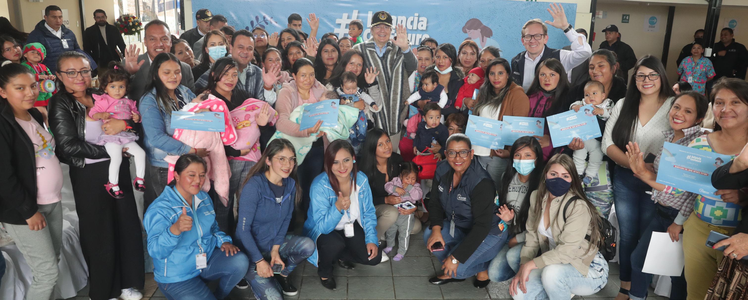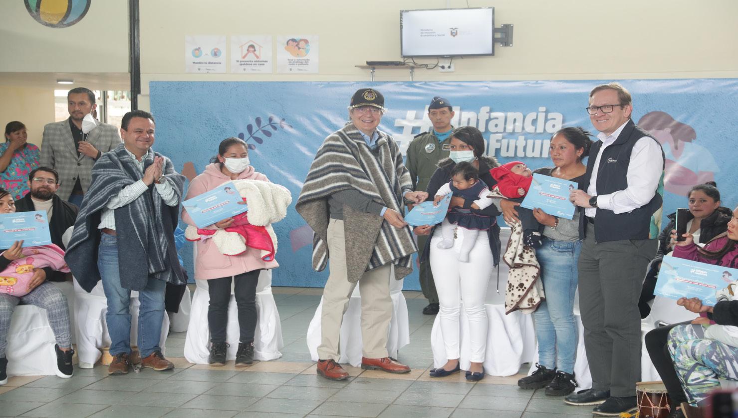 Con acciones reales en beneficio de los más vulnerables, el Gobierno del Encuentro continúa avanzando en su lucha contra la desnutrición crónica infantil (DCI). Este 1 de diciembre, el presidente de la República, Guillermo Lasso, entregó el Bono Infancia Futuro a niños y niñas menores de dos años y madres gestantes de Tulcán (Carchi). El evento se desarrolló en el Centro de Desa rrollo Infantil Sara Espíndola y contó con la participación de decenas de beneficiarios de los servicios sociales del gobierno. Este apoyo económico, que está transfor mando las condiciones de vida de miles de infantes del país, permite la entrega de USD 50 fijos men suales, así como tres montos condiciona dos: uno de USD 90, y dos de USD 120, tras el cumplimiento de algunos paráme tros de corresponsabilidad familiar como atenciones de salud, inscripción temprana, entre otros. “Este es el país que queremos. Queremos niños sanos, niños competitivos cuando sean grandes, que tengan una gran