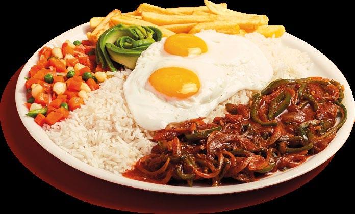 CARNE DE RES AL JUGO, PAPAS, ARROZ, ENSALADA, AGUACATE Y HUEVO FRITO