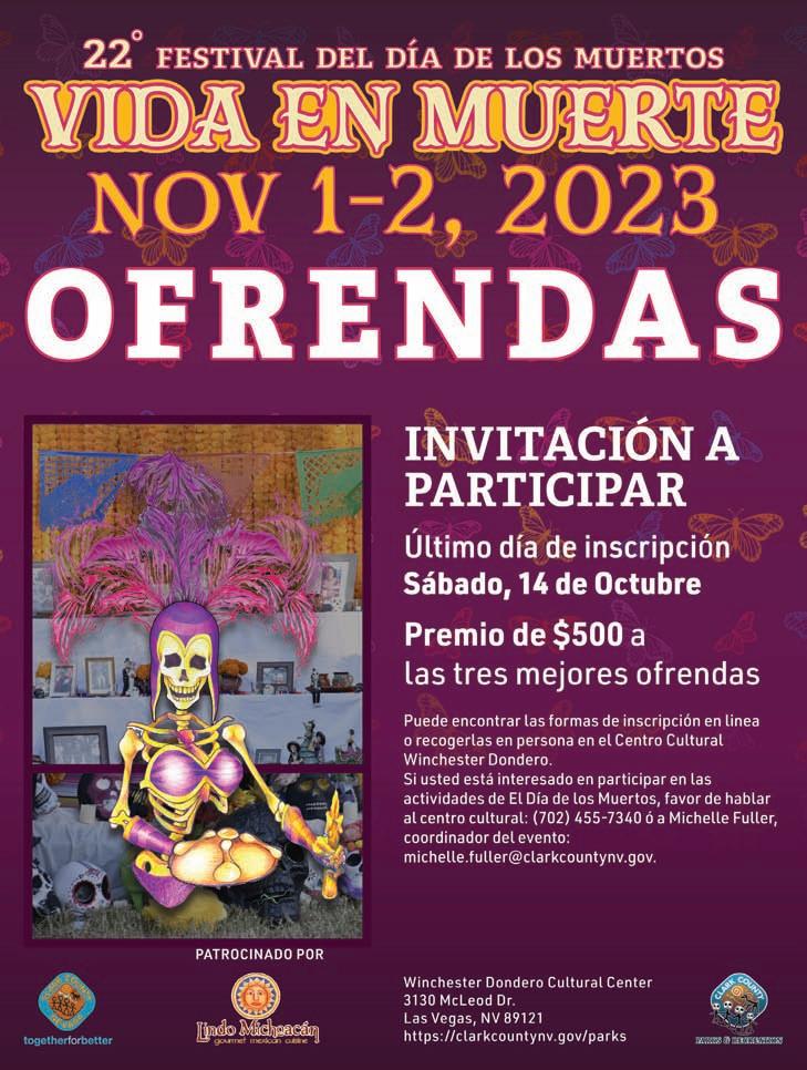 La vigésimo segunda edición del Festival ‘Vida en muerte’, que hace suyo una vez más el Centro Cultural Winchester Dondero, libra su convocatoria. Las personas interesadas pueden obtener más información por intermedio del teléfono (702) 455-8685. La instalación se ubica en el 3130 de la McLeod Dr., cerca de Desert Inn. Cita con Latin Melody en El Dorado Cantina