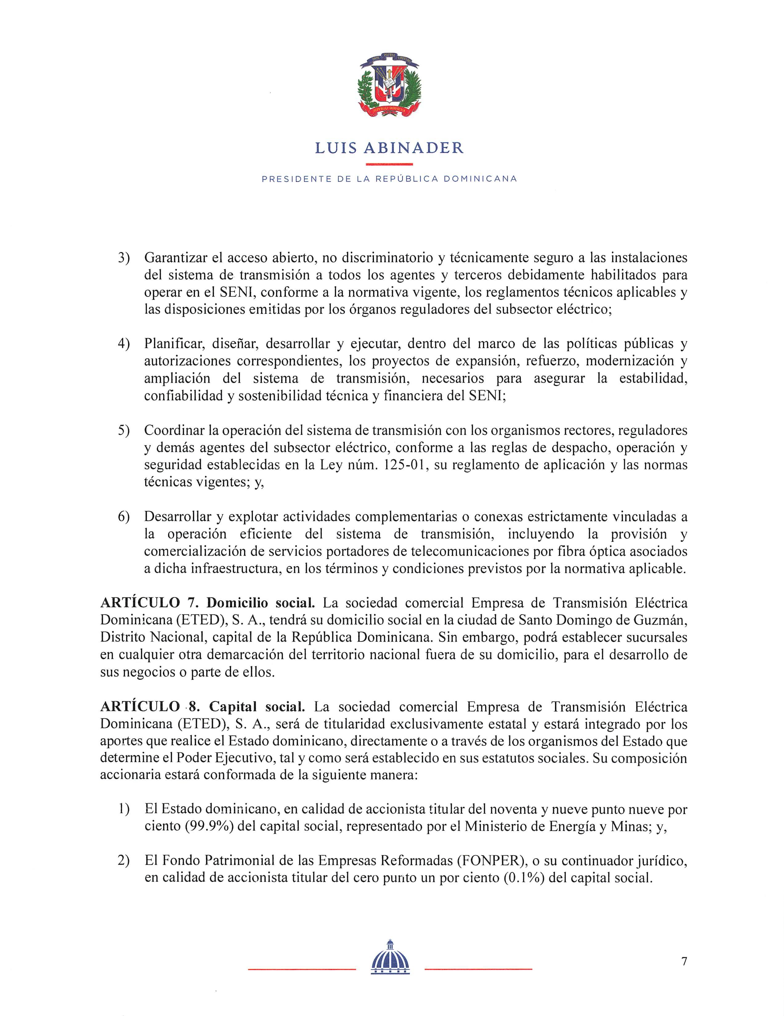 CONSIDERANDO: Que la Empresa de Transmisión Eléctrica Dominicana (ETED) fue creada mediante el Decreto núm. 629-07, al amparo de lo dispuesto en el párrafo 1 del artículo 138 de la Ley núm. 125-01, General de Electricidad, como entidad de propiedad estrictamente estatal destinada a desarrollar funciones estratégicas del Estado dominicano en el subsector eléctrico, particularmente vinculadas a la operación del sistema de transmisión y a la prestación del servicio público de transporte de electricidad.