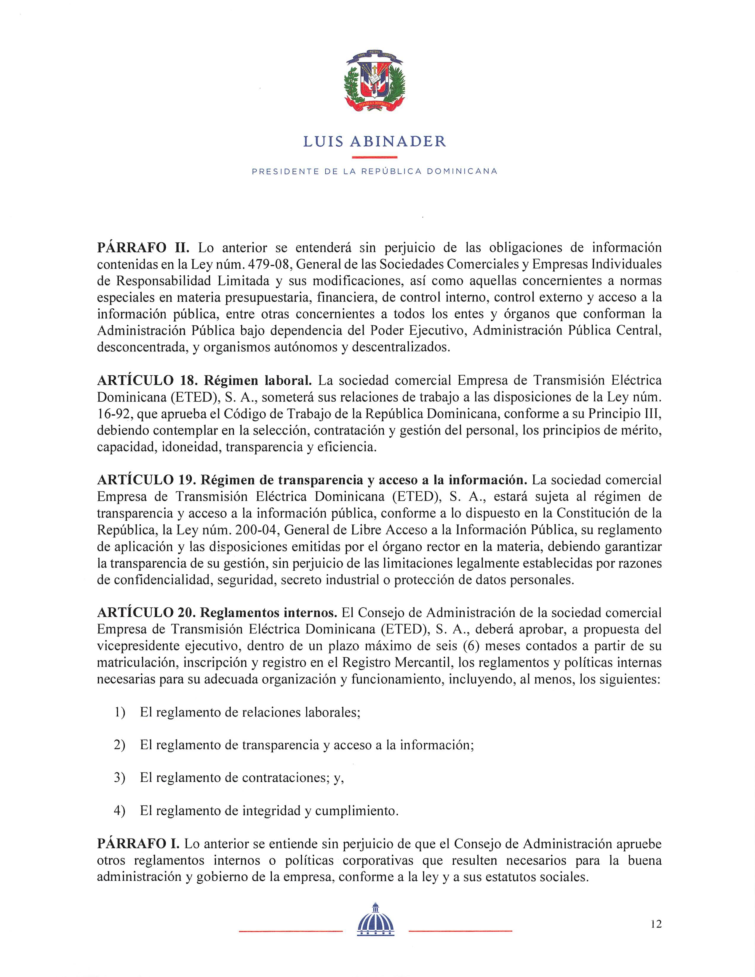 ARTÍCULO 12. Órganos de administración y supervisión. La sociedad comercial Empresa de Transmisión Eléctrica Dominicana (ETED), S. A., estará integrada por los siguientes órganos deliberativos, de supervisión y administración: