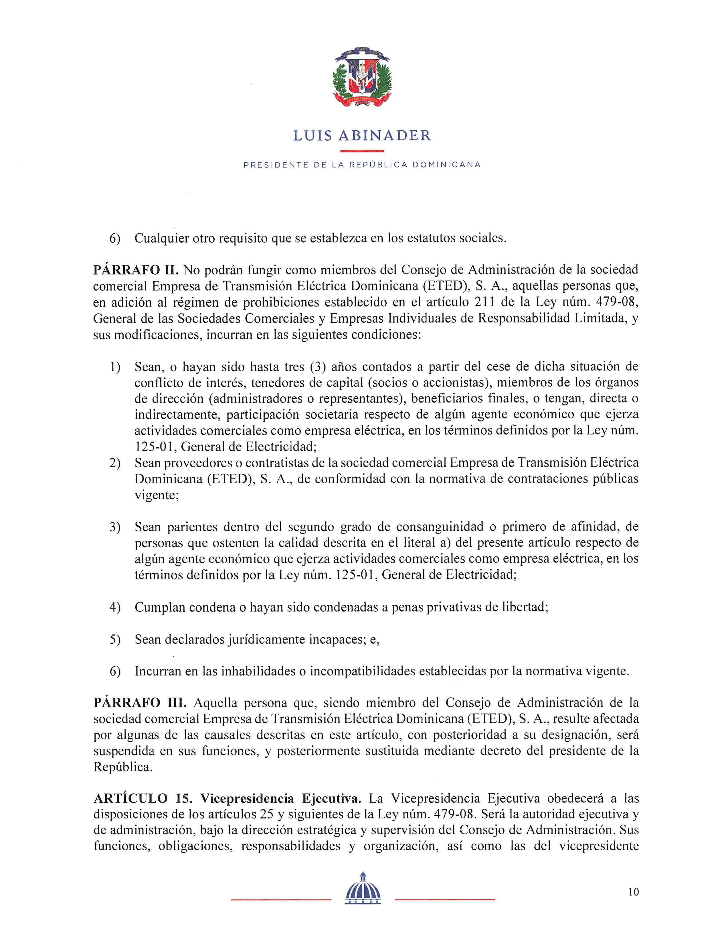 PÁRRAFO II. No podrán fungir como miembros del Consejo de Administración de la sociedad comercial Empresa de Transmisión Eléctrica Dominicana (ETED), S. A., aquellas personas que, en adición al régimen de prohibiciones establecido en el artículo 211 de la Ley núm. 479-08, General de las Sociedades Comerciales y Empresas Individuales de Responsabilidad Limitada, y sus modificaciones, incurran en las siguientes condiciones: