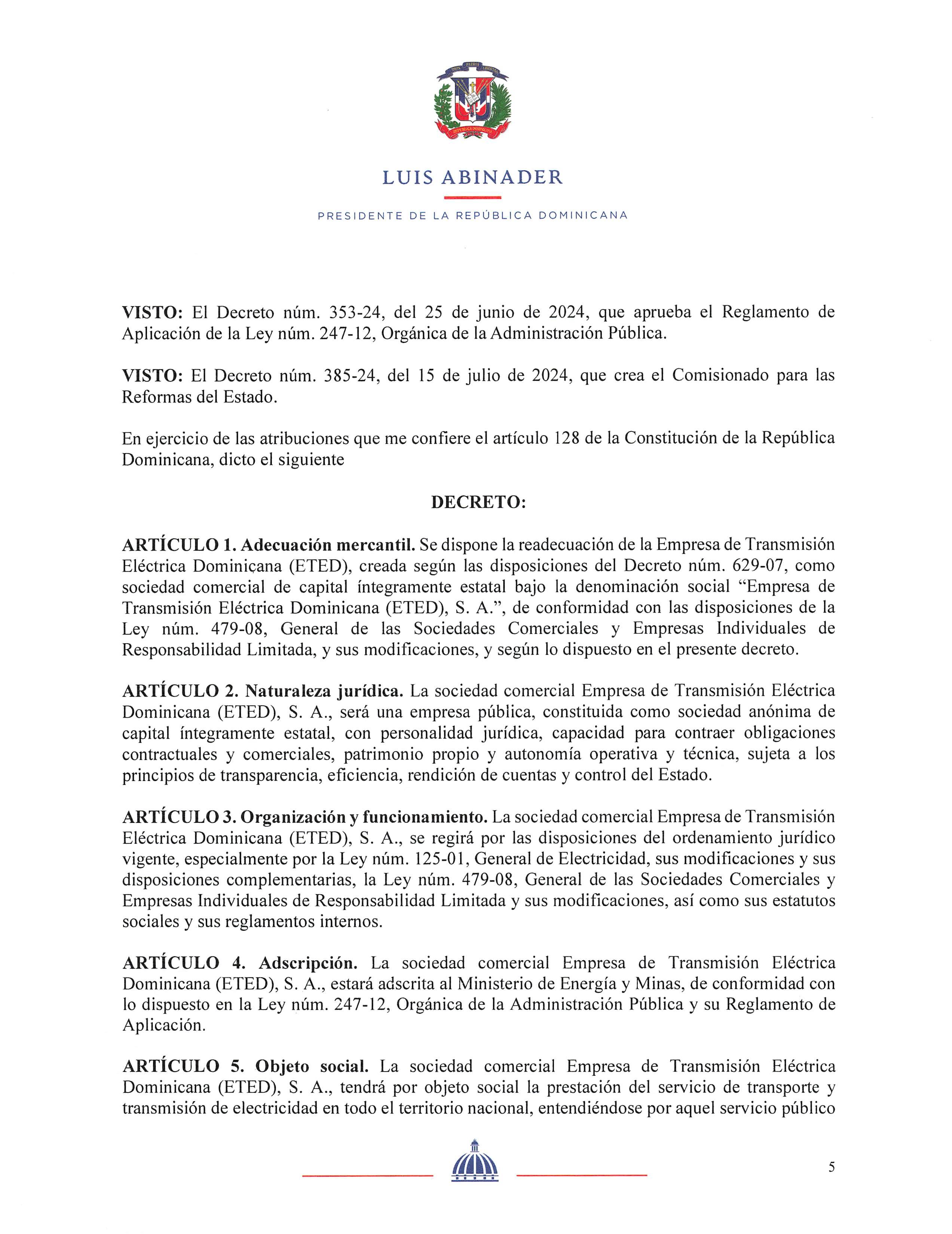 ARTÍCULO 1. Adecuación mercantil. Se dispone la readecuación de la Empresa de Transmisión Eléctrica Dominicana (ETED), creada según las disposiciones del Decreto núm. 629-07, como sociedad comercial de capital íntegramente estatal bajo la denominación social “Empresa de Transmisión Eléctrica Dominicana (ETED), S. A.”, de conformidad con las disposiciones de la Ley núm. 479-08, General de las Sociedades Comerciales y Empresas Individuales de Responsabilidad Limitada, y sus modificaciones, y según lo dispuesto en el presente decreto.
