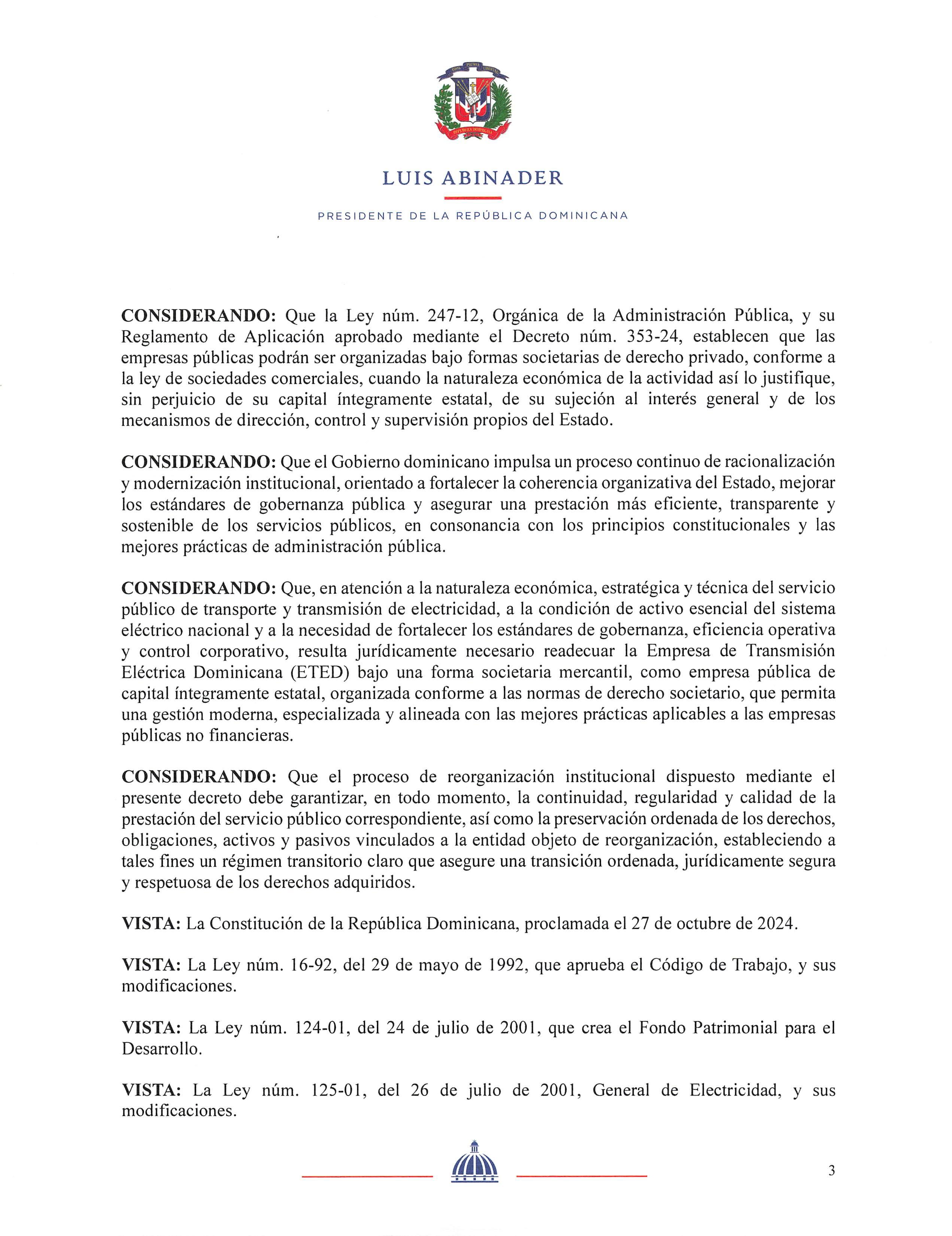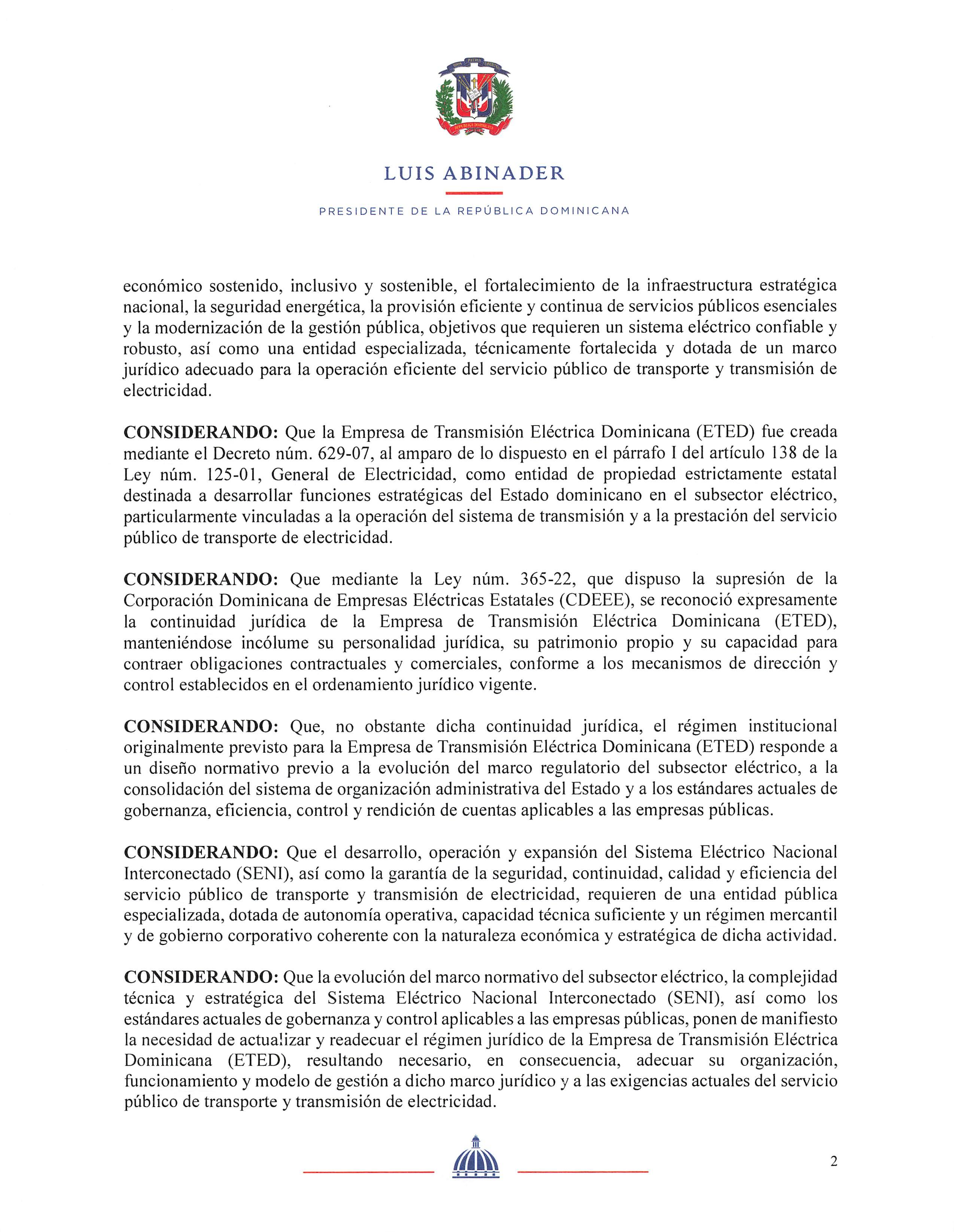 CONSIDERANDO: Que mediante la Ley núm. 365-22, que dispuso la supresión de la Corporación Dominicana de Empresas Eléctricas Estatales (CDEEE), se reconoció expresamente la continuidad jurídica de la Empresa de Transmisión Eléctrica Dominicana (ETED), manteniéndose incólume su personalidad jurídica, su patrimonio propio y su capacidad para contraer obligaciones contractuales y comerciales, conforme a los mecanismos de dirección y control establecidos en el ordenamiento jurídico vigente.