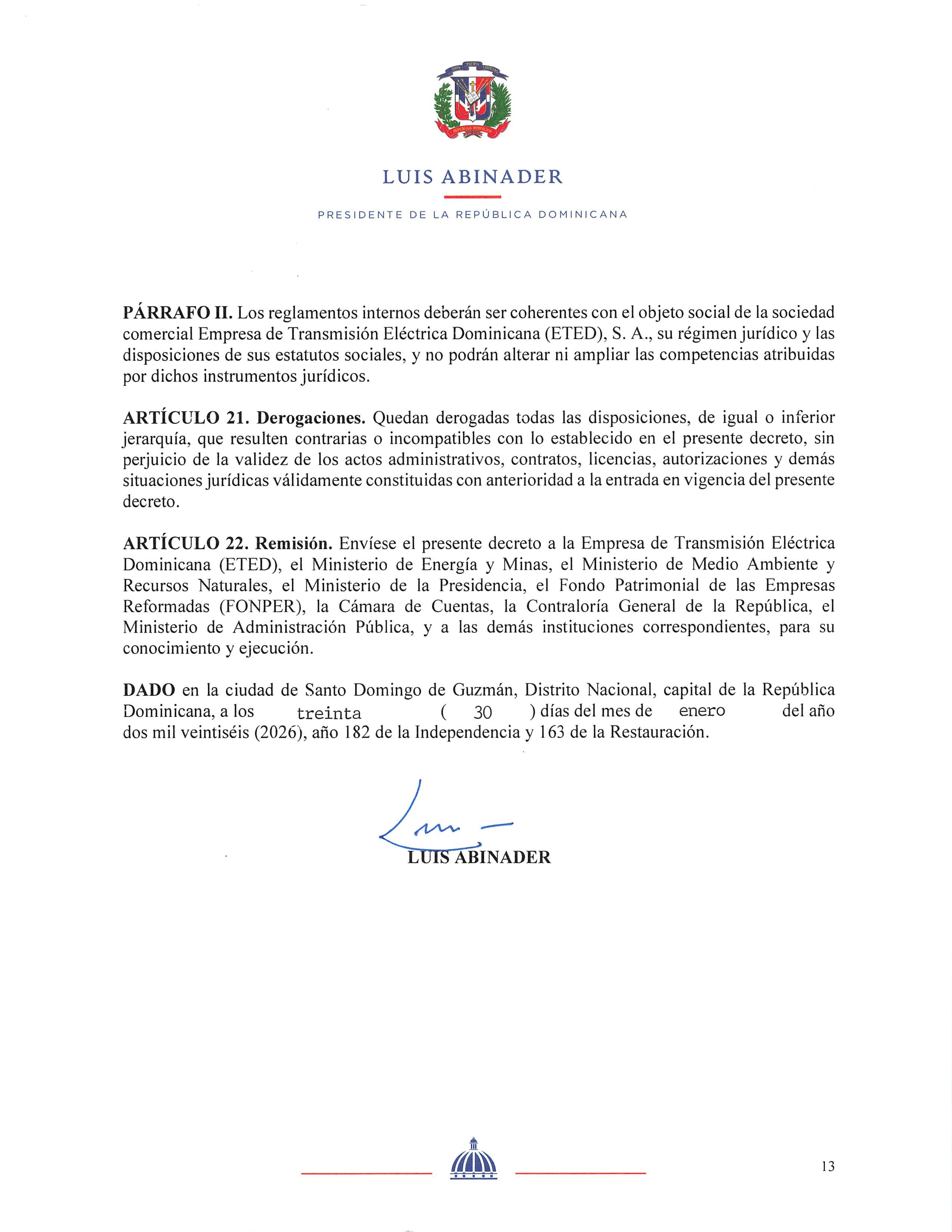 ARTÍCULO 22. Remisión. Envíese el presente decreto a la Empresa de Transmisión Eléctrica Dominicana (ETED), el Ministerio de Energía y Minas, el Ministerio de Medio Ambiente y Recursos Naturales, el Ministerio de la Presidencia, el Fondo Patrimonial de las Empresas Reformadas (FONPER), la Cámara de Cuentas, la Contraloría General de la República, el Ministerio de Administración Pública, y a las demás instituciones correspondientes, para su conocimiento y ejecución.