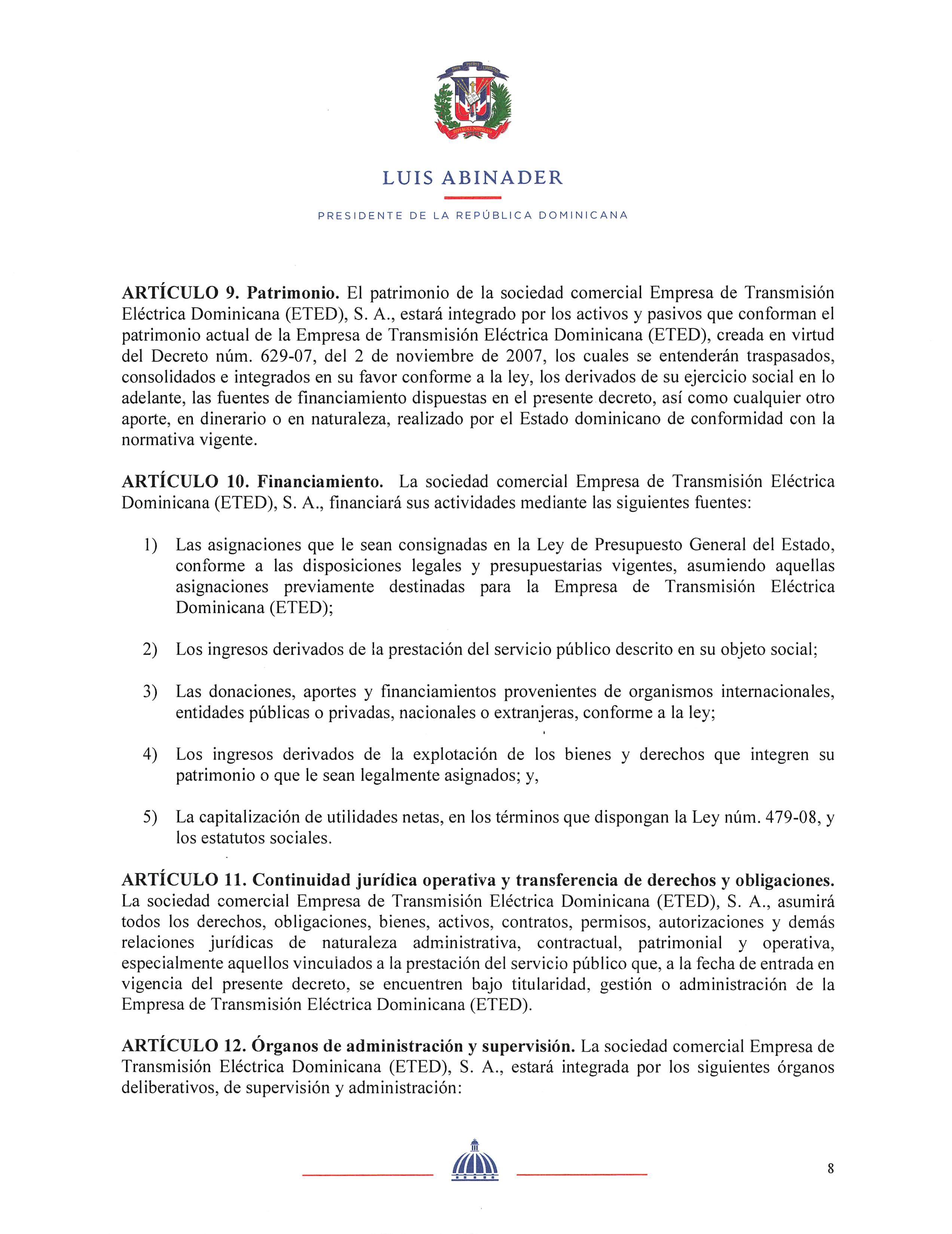 ARTÍCULO 9. Patrimonio. El patrimonio de la sociedad comercial Empresa de Transmisión Eléctrica Dominicana (ETED), S. A., estará integrado por los activos y pasivos que conforman el patrimonio actual de la Empresa de Transmisión Eléctrica Dominicana (ETED), creada en virtud del Decreto núm. 629-07, del 2 de noviembre de 2007, los cuales se entenderán traspasados, consolidados e integrados en su favor conforme a la ley, los derivados de su ejercicio social en lo adelante, las fuentes de financiamiento dispuestas en el presente decreto, así como cualquier otro aporte, en dinerario o en naturaleza, realizado por el Estado dominicano de conformidad con la normativa vigente.
