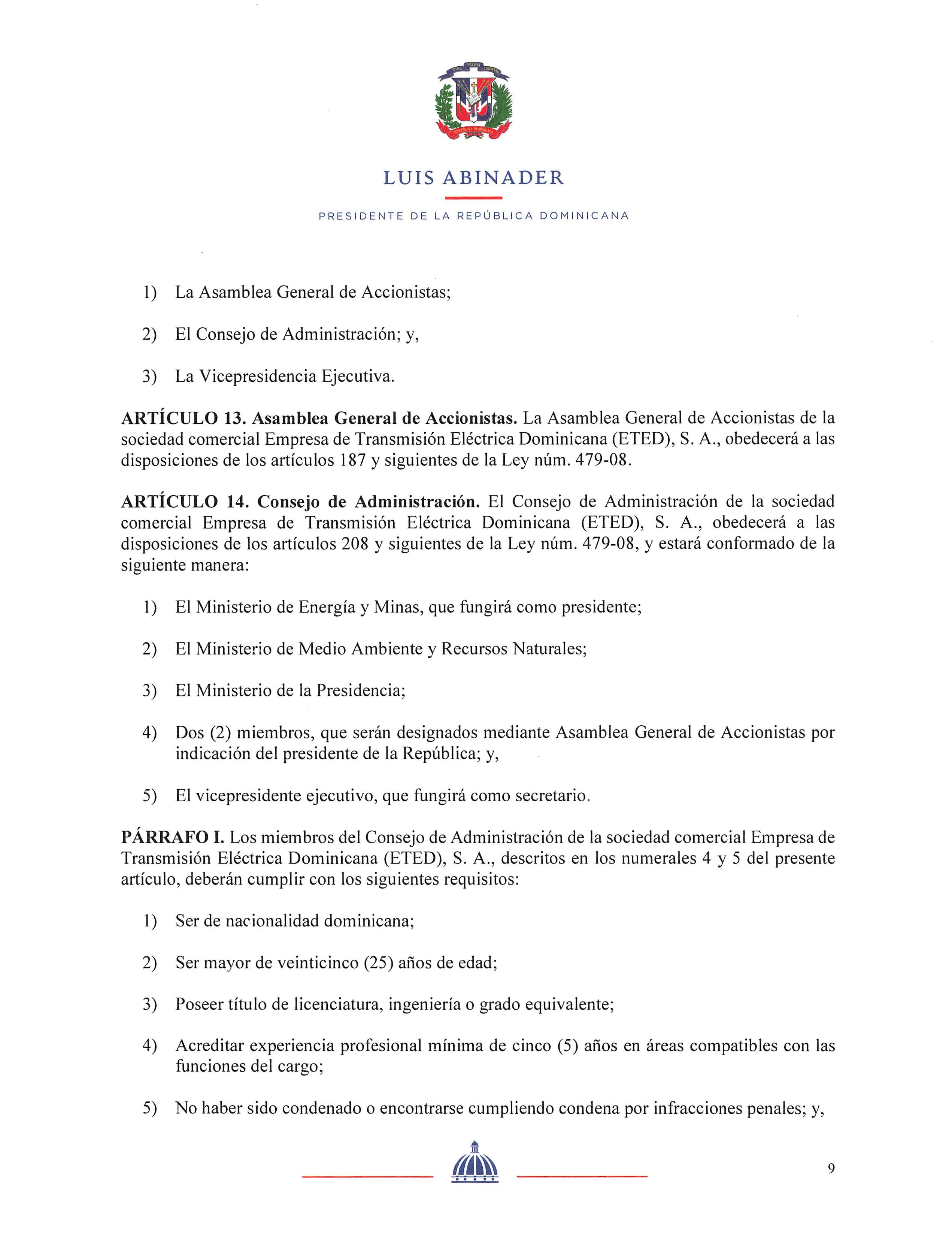 ARTÍCULO 14. Consejo de Administración. El Consejo de Administración de la sociedad comercial Empresa de Transmisión Eléctrica Dominicana (ETED), S. A., obedecerá a las disposiciones de los artículos 208 y siguientes de la Ley núm. 479-08, y estará conformado de la siguiente manera: