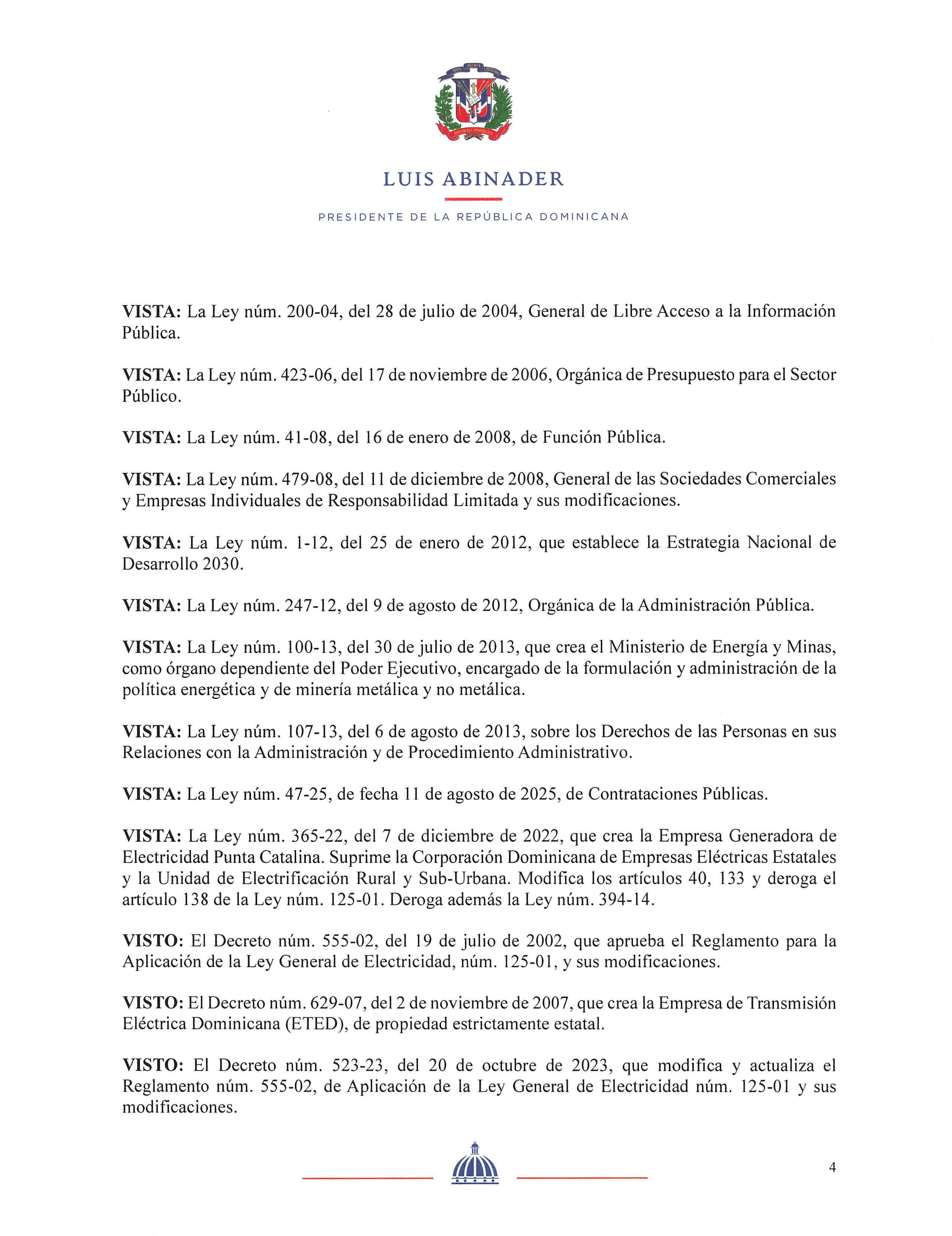 VISTO: El Decreto núm. 523-23, del 20 de octubre de 2023, que modifica y actualiza el Reglamento núm. 555-02, de Aplicación de la Ley General de Electricidad núm. 125-01 y sus modificaciones.