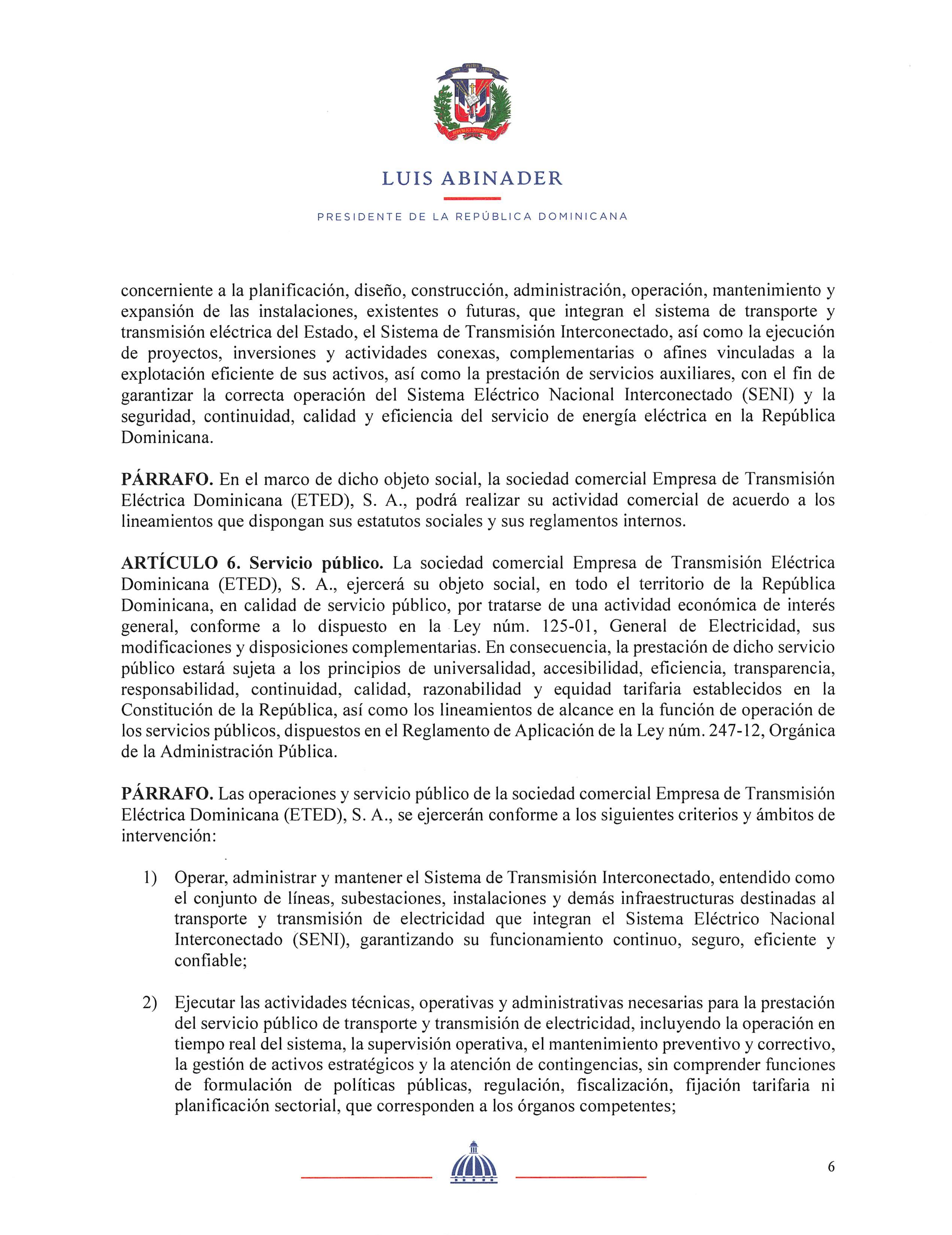 PÁRRAFO. Las operaciones y servicio público de la sociedad comercial Empresa de Transmisión Eléctrica Dominicana (ETED), S. A., se ejercerán conforme a los siguientes criterios y ámbitos de intervención;