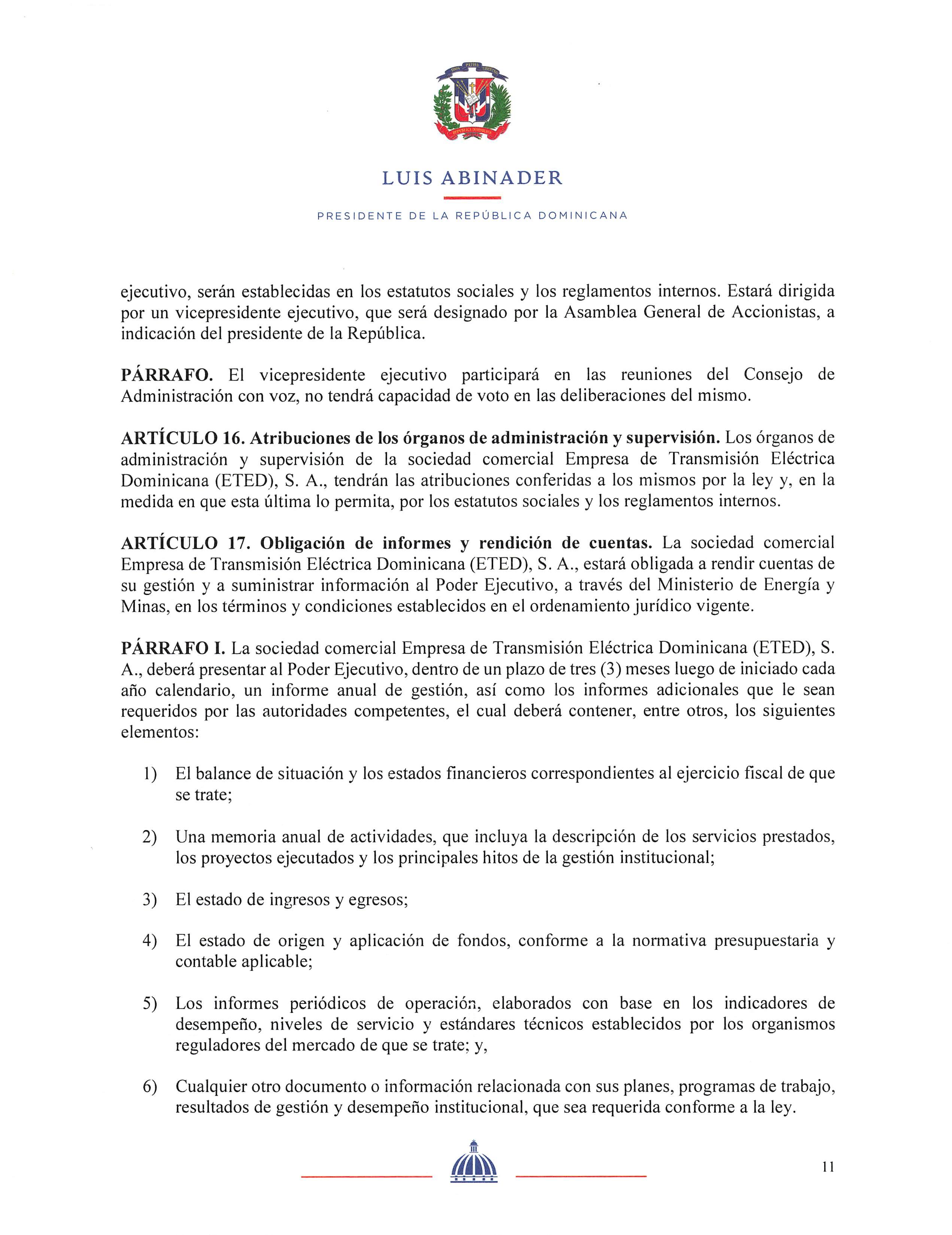 ARTÍCULO 16. Atribuciones de los órganos de administración y supervisión. Los órganos de administración y supervisión de la sociedad comercial Empresa de Transmisión Eléctrica Dominicana (ETED), S. A., tendrán las atribuciones conferidas a los mismos por la ley y, en la medida en que esta última lo permita, por los estatutos sociales y los reglamentos internos.