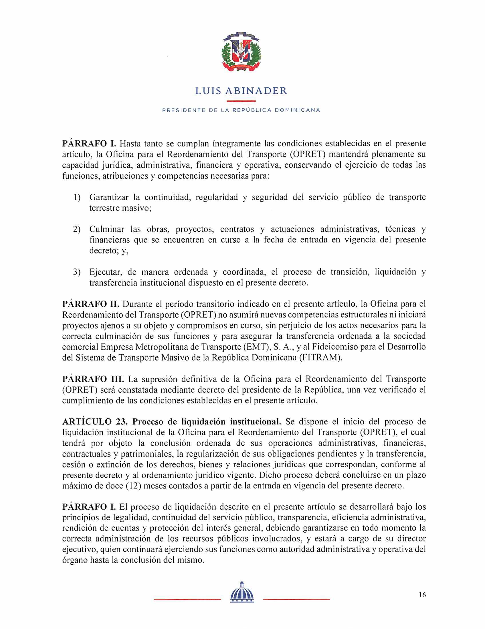 PÁRRAFO III. La supresión definitiva de la Oficina para el Reordenamiento del Transporte (OPRET) será constatada mediante decreto del presidente de la República, una vez verificado el cumplimiento de las condiciones establecidas en el presente artículo.