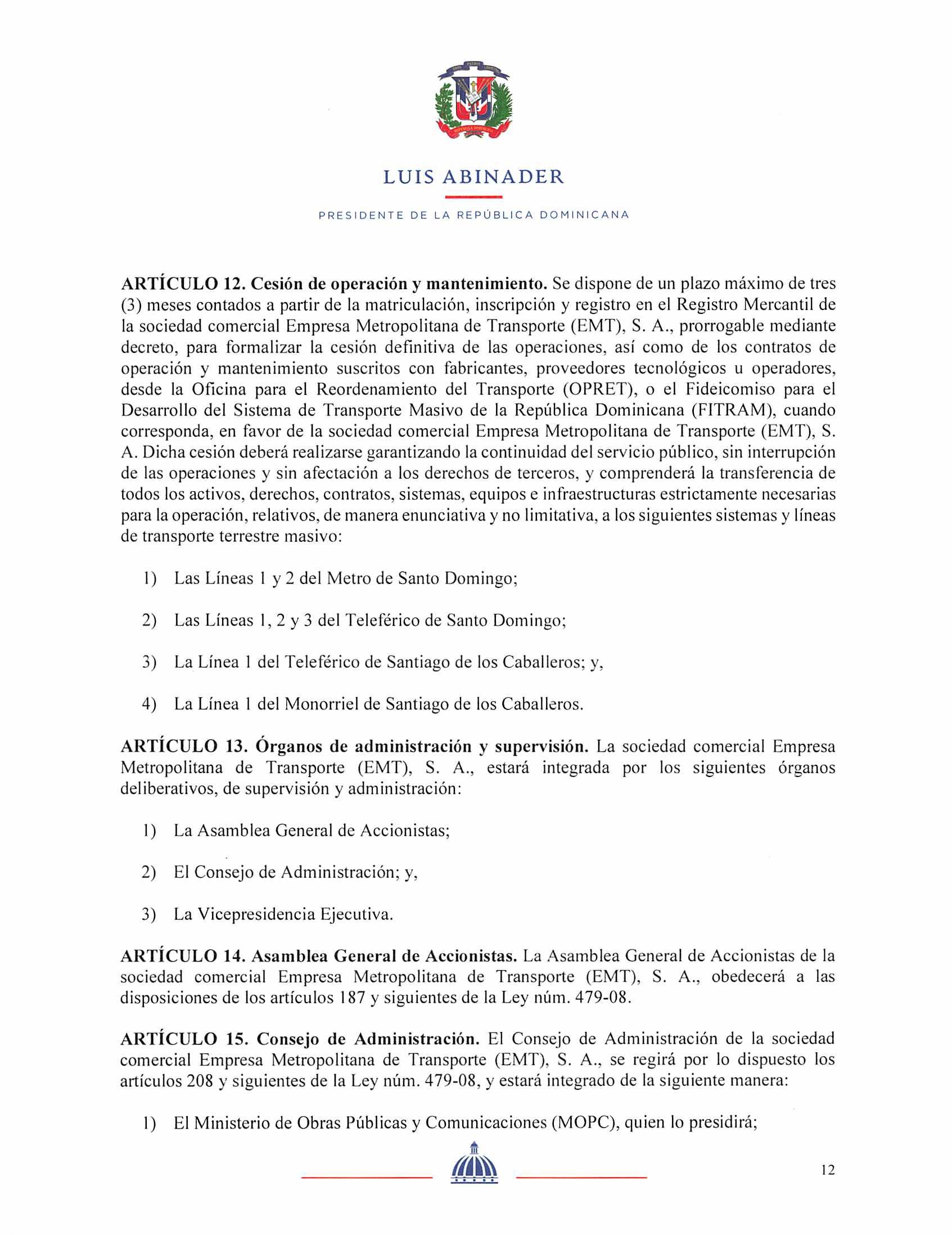 ARTÍCULO 12. Cesión de operación y mantenimiento. Se dispone de un plazo máximo de tres (3) meses contados a partir de la matriculación, inscripción y registro en el Registro Mercantil de la sociedad comercial Empresa Metropolitana de Transporte (EMT), S. A., prorrogable mediante decreto, para formalizar la cesión definitiva de las operaciones, así como de los contratos de operación y mantenimiento suscritos con fabricantes, proveedores tecnológicos u operadores, desde la Oficina para el Reordenamiento del Transporte (OPRET), o el Fideicomiso para el Desarrollo del Sistema de Transporte Masivo de la República Dominicana (FITRAM), cuando corresponda, en favor de la sociedad comercial Empresa Metropolitana de Transporte (EMT), S. A. Dicha cesión deberá realizarse garantizando la continuidad del servicio público, sin interrupción de las operaciones y sin afectación a los derechos de terceros, y comprenderá la transferencia de todos los activos, derechos, contratos, sistemas, equipos e infraestructuras estrictamente necesarias para la operación, relativos, de manera enunciativa y no limitativa, a los siguientes sistemas y líneas de transporte terrestre masivo: