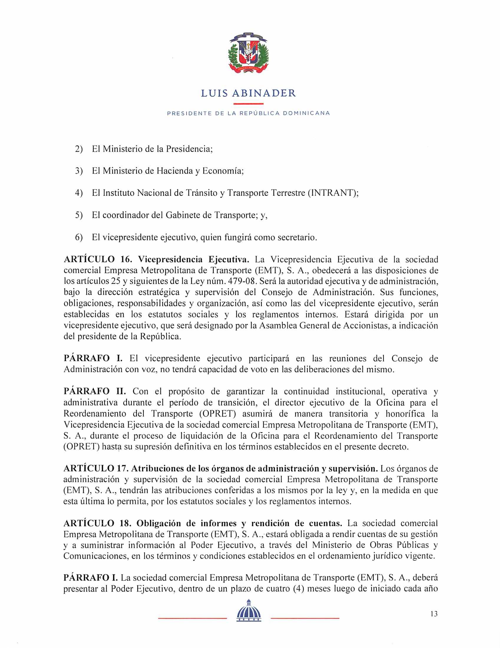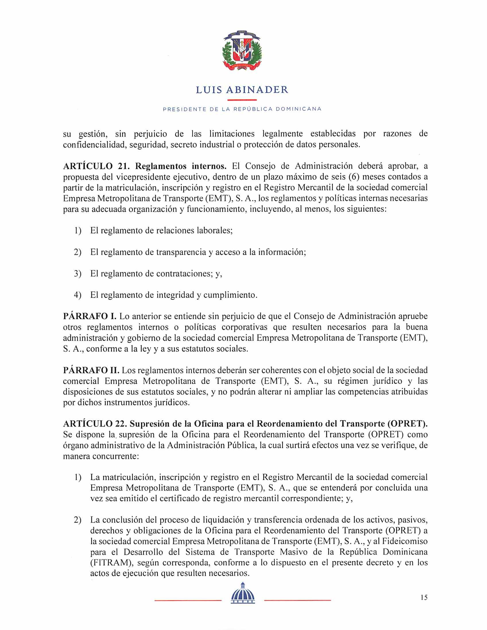PÁRRAFO II. Con el propósito de garantizar la continuidad institucional, operativa y administrativa durante el período de transición, el director ejecutivo de la Oficina para el Reordenamiento del Transporte (OPRET) asumirá de manera transitoria y honorífica la Vicepresidencia Ejecutiva de la sociedad comercial Empresa Metropolitana de Transporte (EMT), S. A., durante el proceso de liquidación de la Oficina para el Reordenamiento del Transporte (OPRET) hasta su supresión definitiva en los términos establecidos en el presente decreto.