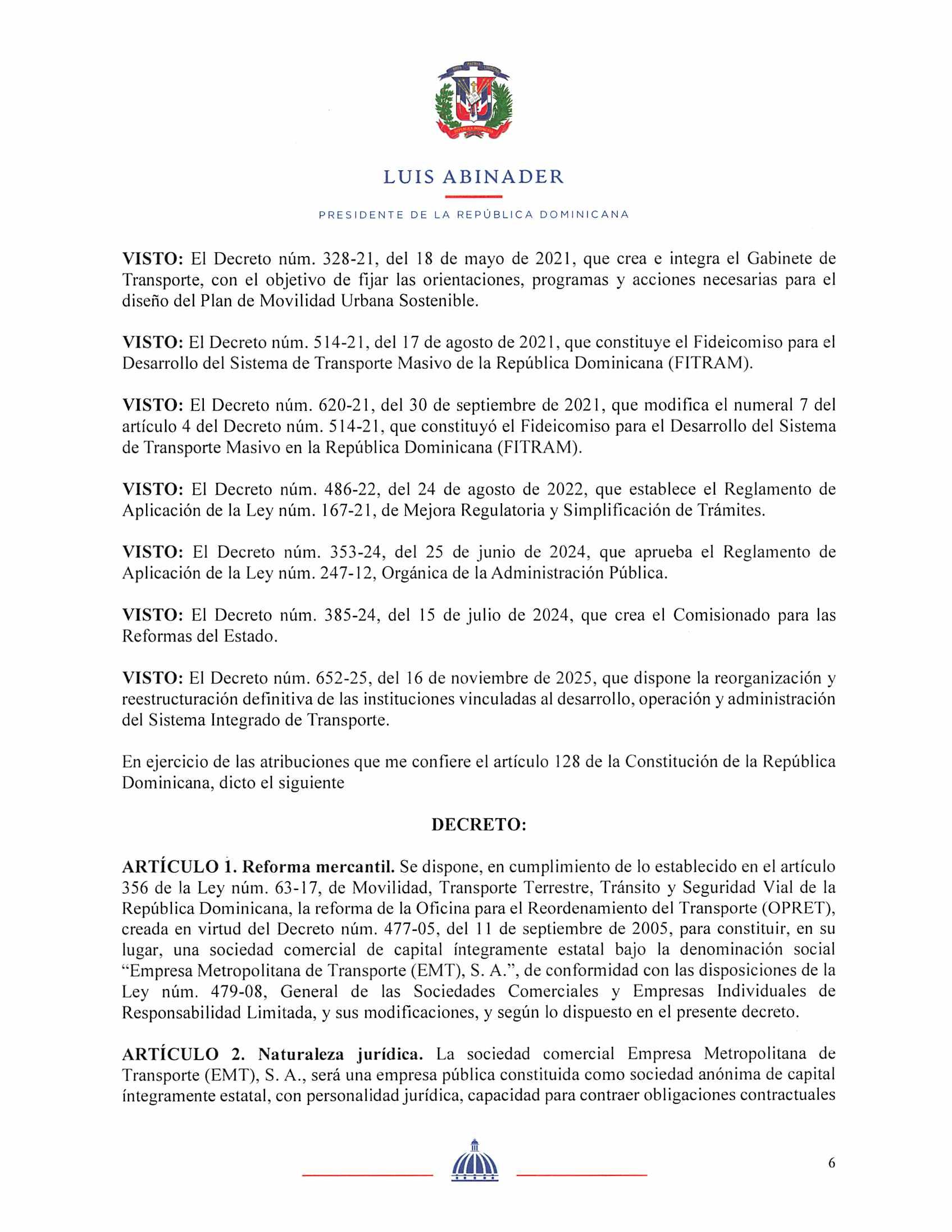 VISTO: El Decreto núm. 652-25, del 16 de noviembre de 2025, que dispone la reorganización y reestructuración definitiva de las instituciones vinculadas al desarrollo, operación y administración del Sistema Integrado de Transporte.