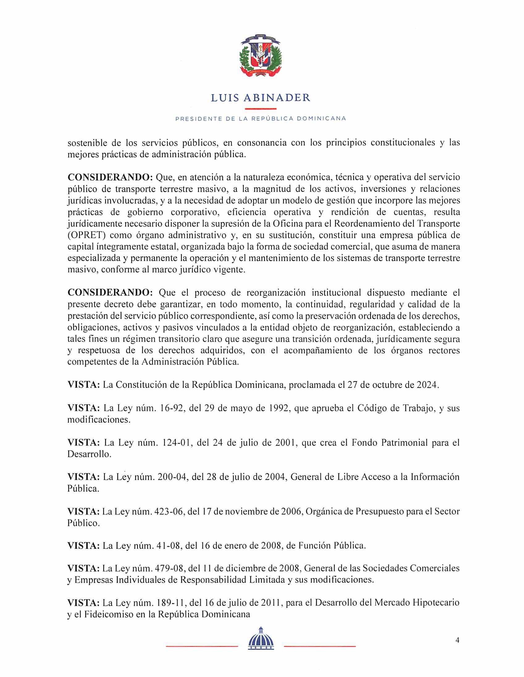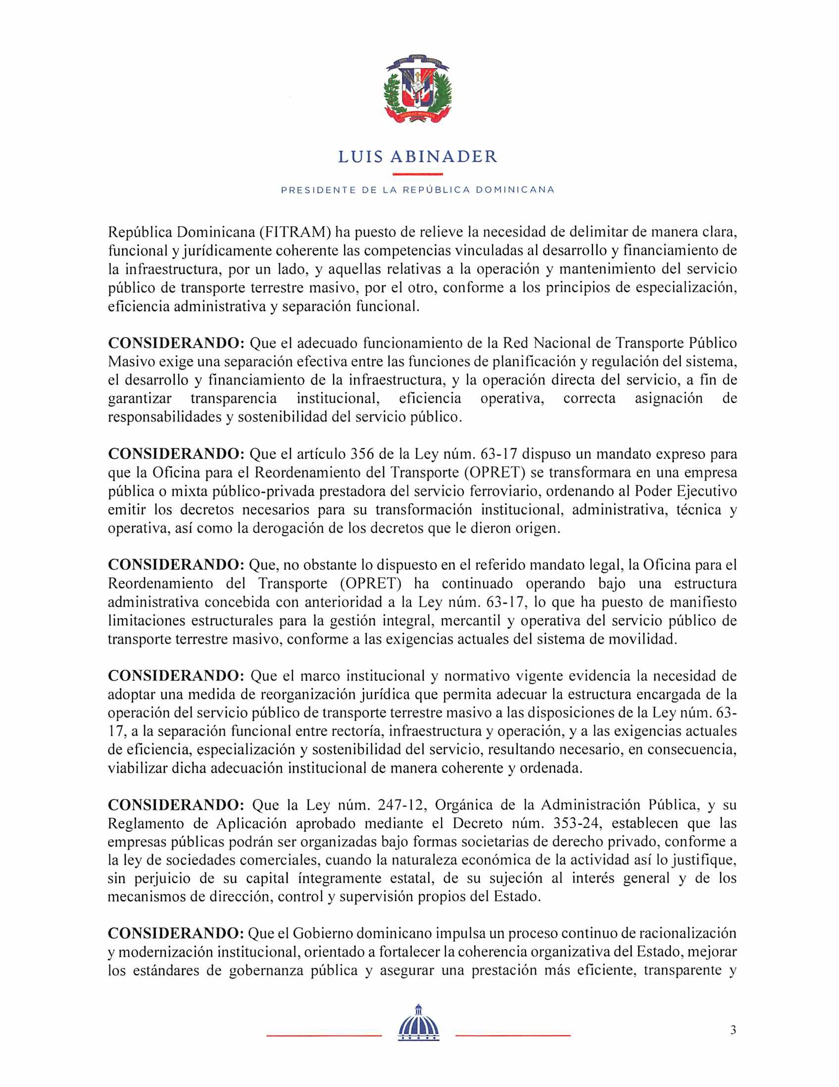 CONSIDERANDO: Que el artículo 356 de la Ley núm. 63-17 dispuso un mandato expreso para que la Oficina para el Reordenamiento del Transporte (OPRET) se transformara en una empresa pública o mixta público-privada prestadora del servicio ferroviario, ordenando al Poder Ejecutivo emitir los decretos necesarios para su transformación institucional, administrativa, técnica y operativa, así como la derogación de los decretos que le dieron origen.