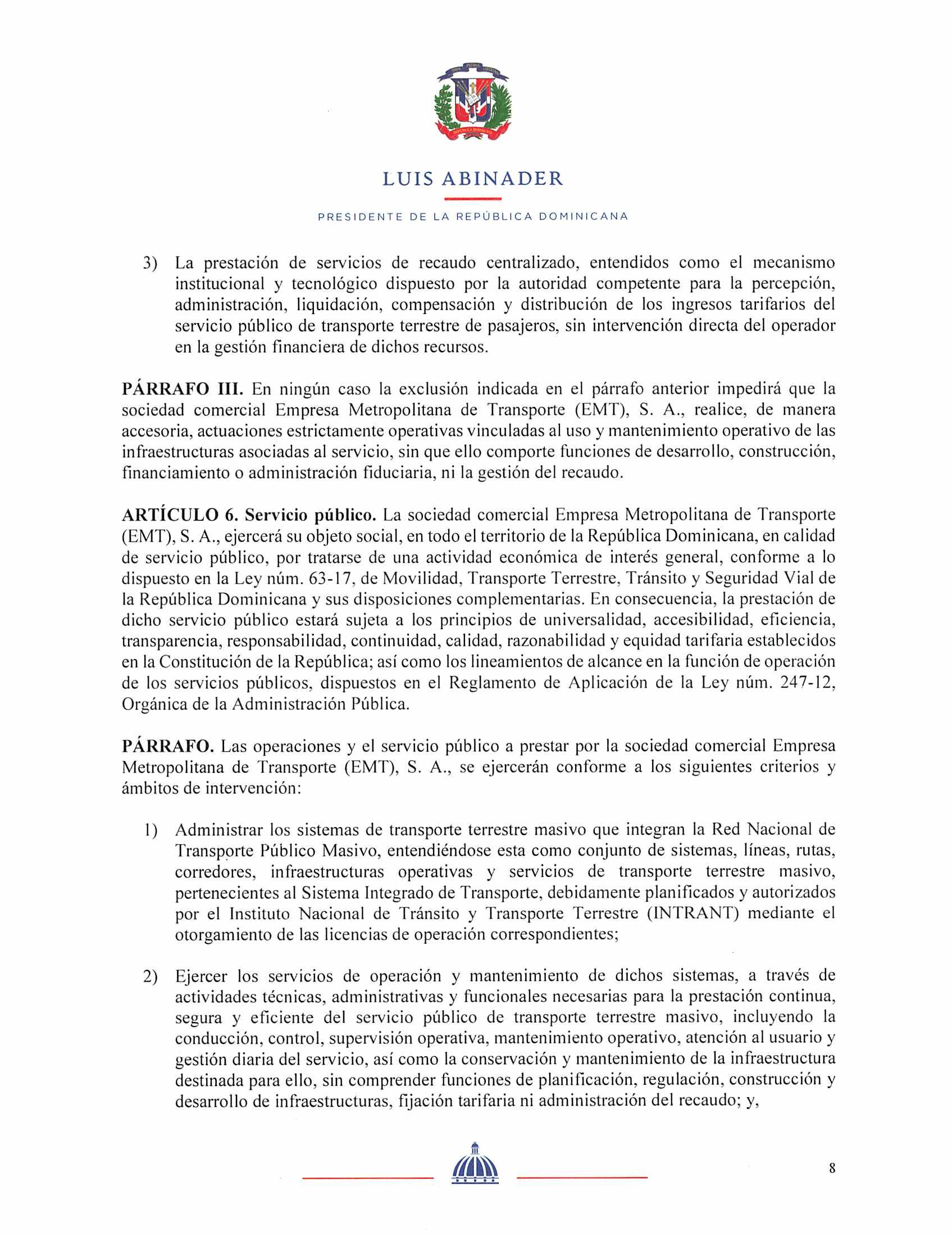 ARTÍCULO 6. Servicio público. La sociedad comercial Empresa Metropolitana de Transporte (EMT), S. A., ejercerá su objeto social, en todo el territorio de la República Dominicana, en calidad de servicio público, por tratarse de una actividad económica de interés general, conforme a lo dispuesto en la Ley núm. 63-17, de Movilidad, Transporte Terrestre. Tránsito y Seguridad Vial de la República Dominicana y sus disposiciones complementarias. En consecuencia, la prestación de dicho servicio público estará sujeta a ios principios de universalidad, accesibilidad, eficiencia, transparencia, responsabilidad, continuidad, calidad, razonabilidad y equidad tarifaria establecidos en la Constitución de la República; así como los lincamientos de alcance en la función de operación de los servicios públicos, dispuestos en el Reglamento de Aplicación de la Ley núm. 247-12, Orgánica de la Administración Pública.