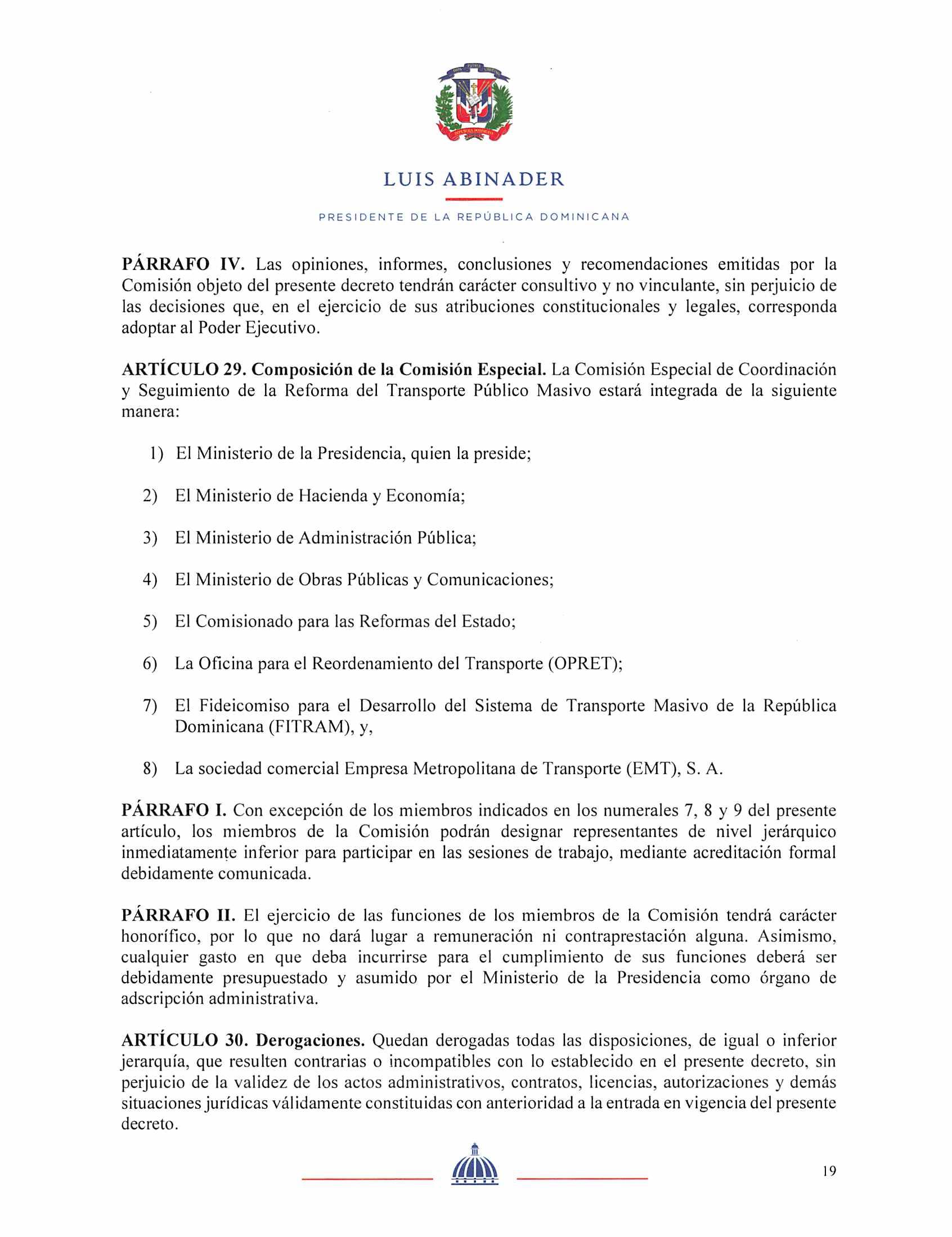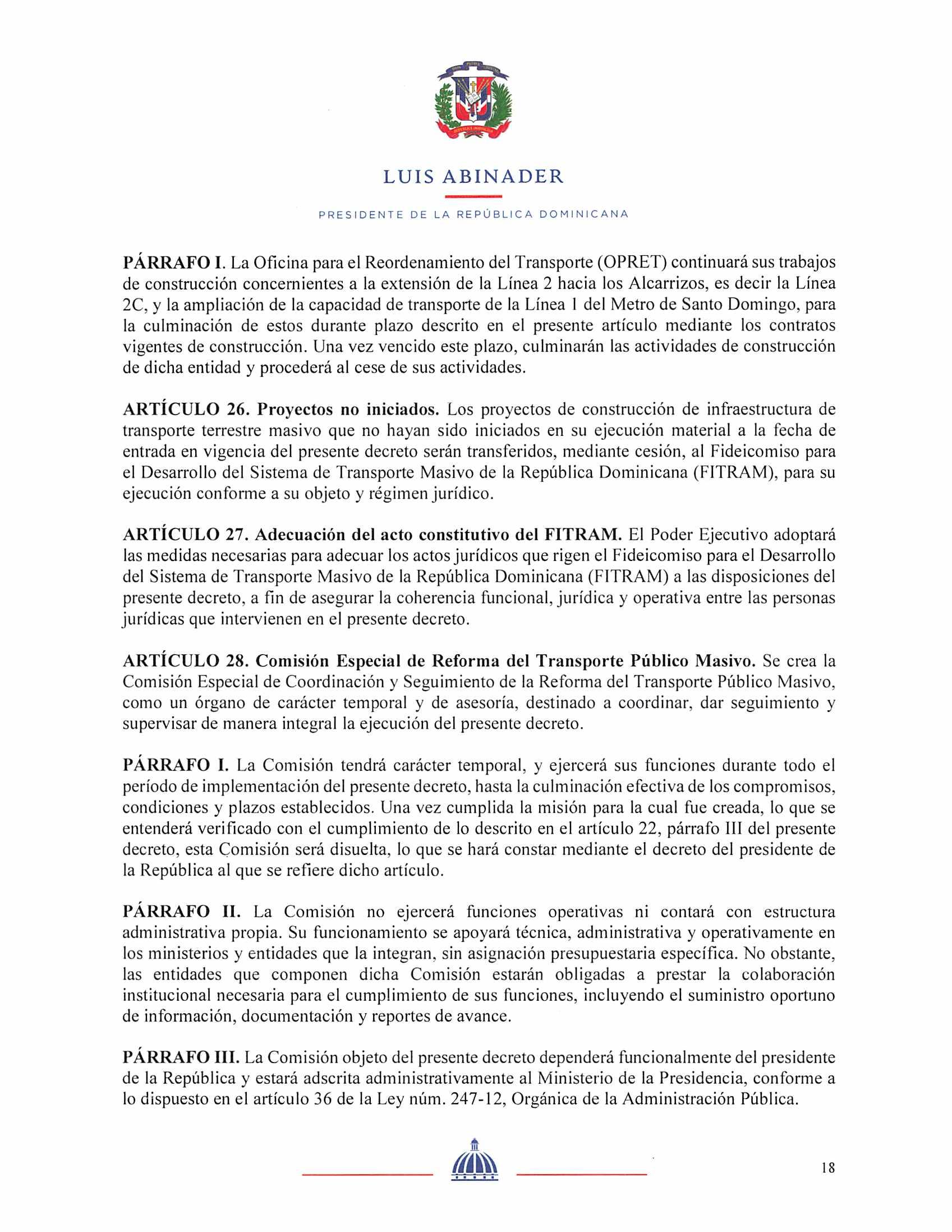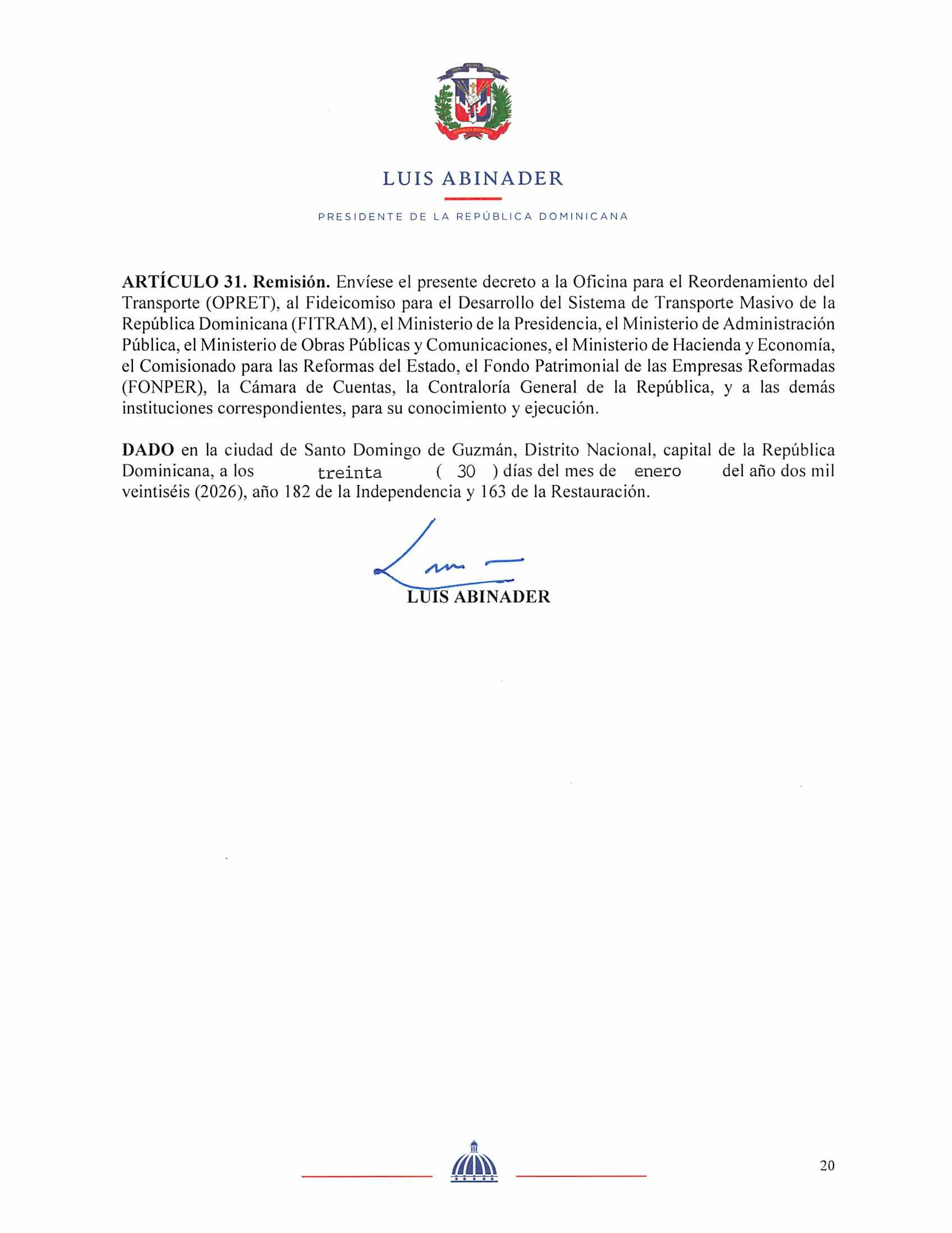 ARTÍCULO 31. Remisión. Envíese el presente decreto a la Oficina para el Reordenamiento del Transporte (OPRET), al Fideicomiso para el Desarrollo del Sistema de Transporte Masivo de la República Dominicana (FITRAM), el Ministerio de la Presidencia, el Ministerio de Administración Pública, el Ministerio de Obras Públicas y Comunicaciones, el Ministerio de Flacienda y Economía, el Comisionado para las Reformas del Estado, el Fondo Patrimonial de las Empresas Reformadas (FONPER), la Cámara de Cuentas, la Contraloría General de la República, y a las demás instituciones correspondientes, para su conocimiento y ejecución.