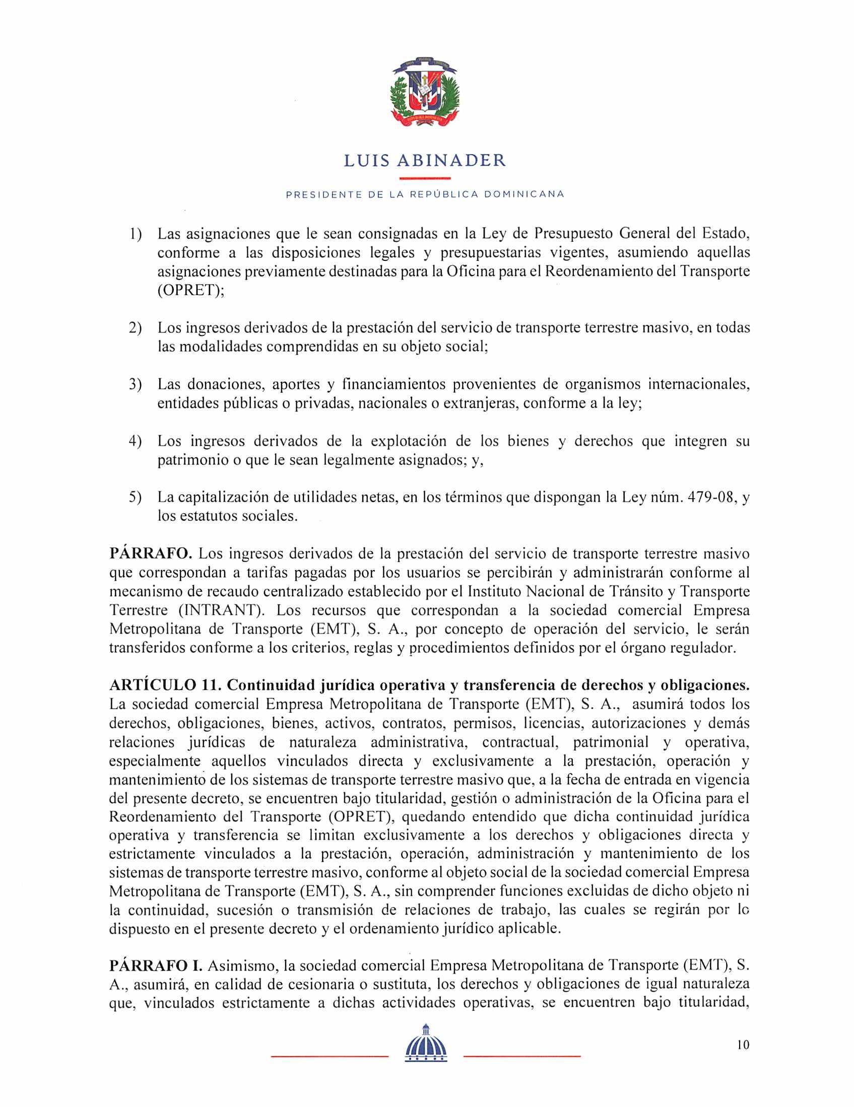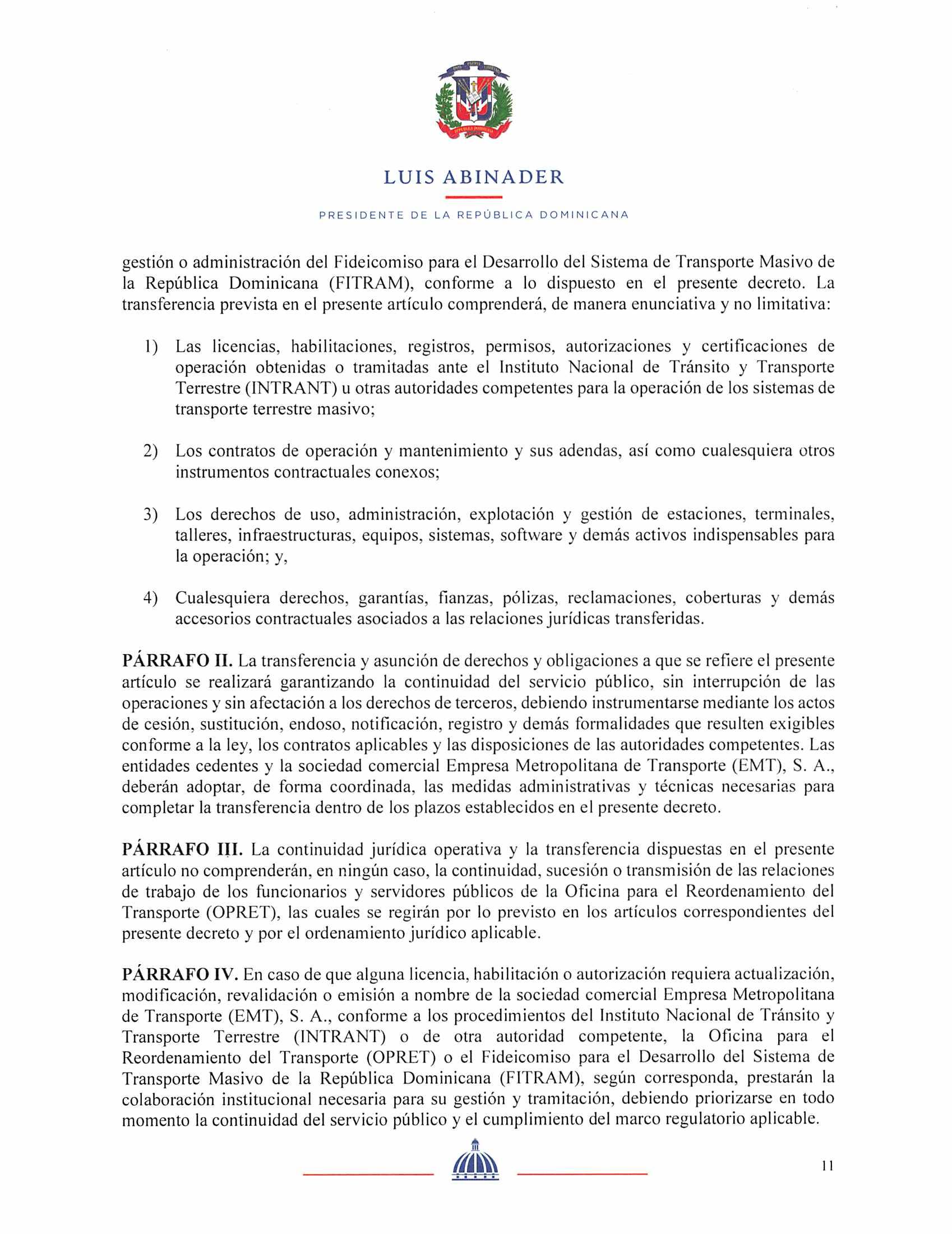 ARTÍCULO 11. Continuidad jurídica operativa y transferencia de derechos y obligaciones. La sociedad comercial Empresa Metropolitana de Transporte (EMT), S. A., asumirá todos los derechos, obligaciones, bienes, activos, contratos, permisos, licencias, autorizaciones y demás relaciones jurídicas de naturaleza administrativa, contractual, patrimonial y operativa, especialmente aquellos vinculados directa y exclusivamente a la prestación, operación y mantenimiento de los sistemas de transporte terrestre masivo que, a la fecha de entrada en vigencia del presente decreto, se encuentren bajo titularidad, gestión o administración de la Oficina para el Reordenamiento del Transporte (OPRET), quedando entendido que dicha continuidad jurídica operativa y transferencia se limitan exclusivamente a los derechos y obligaciones directa y estrictamente vinculados a la prestación, operación, administración y mantenimiento de los sistemas de transporte terrestre masivo, conforme al objeto social de la sociedad comercial Empresa Metropolitana de Transporte (EMT), S. A., sin comprender funciones excluidas de dicho objeto ni la continuidad, sucesión o transmisión de relaciones de trabajo, las cuales se regirán por lo dispuesto en el presente decreto y el ordenamiento jurídico aplicable.