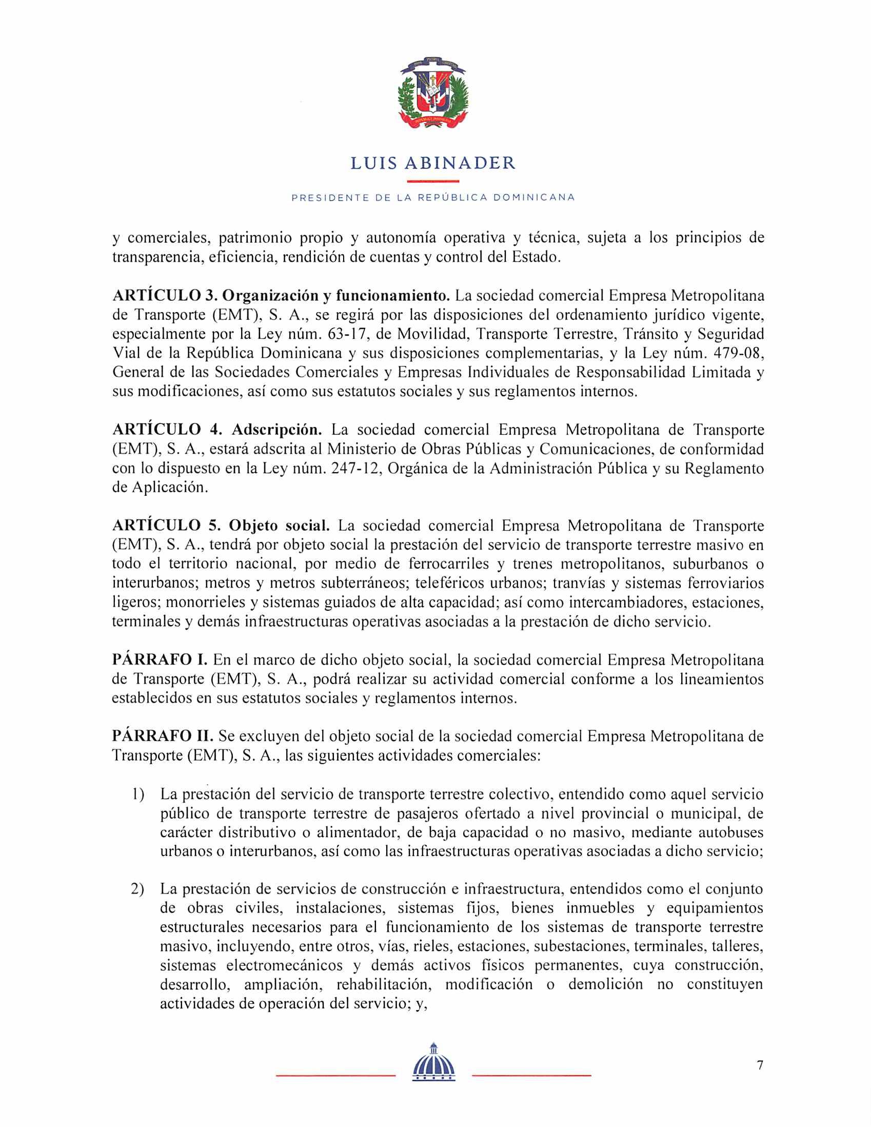 PÁRRAFO I. En el marco de dicho objeto social, la sociedad comercial Empresa Metropolitana de Transporte (EMT), S. A., podrá realizar su actividad comercial conforme a los lineamientos establecidos en sus estatutos sociales y reglamentos internos.