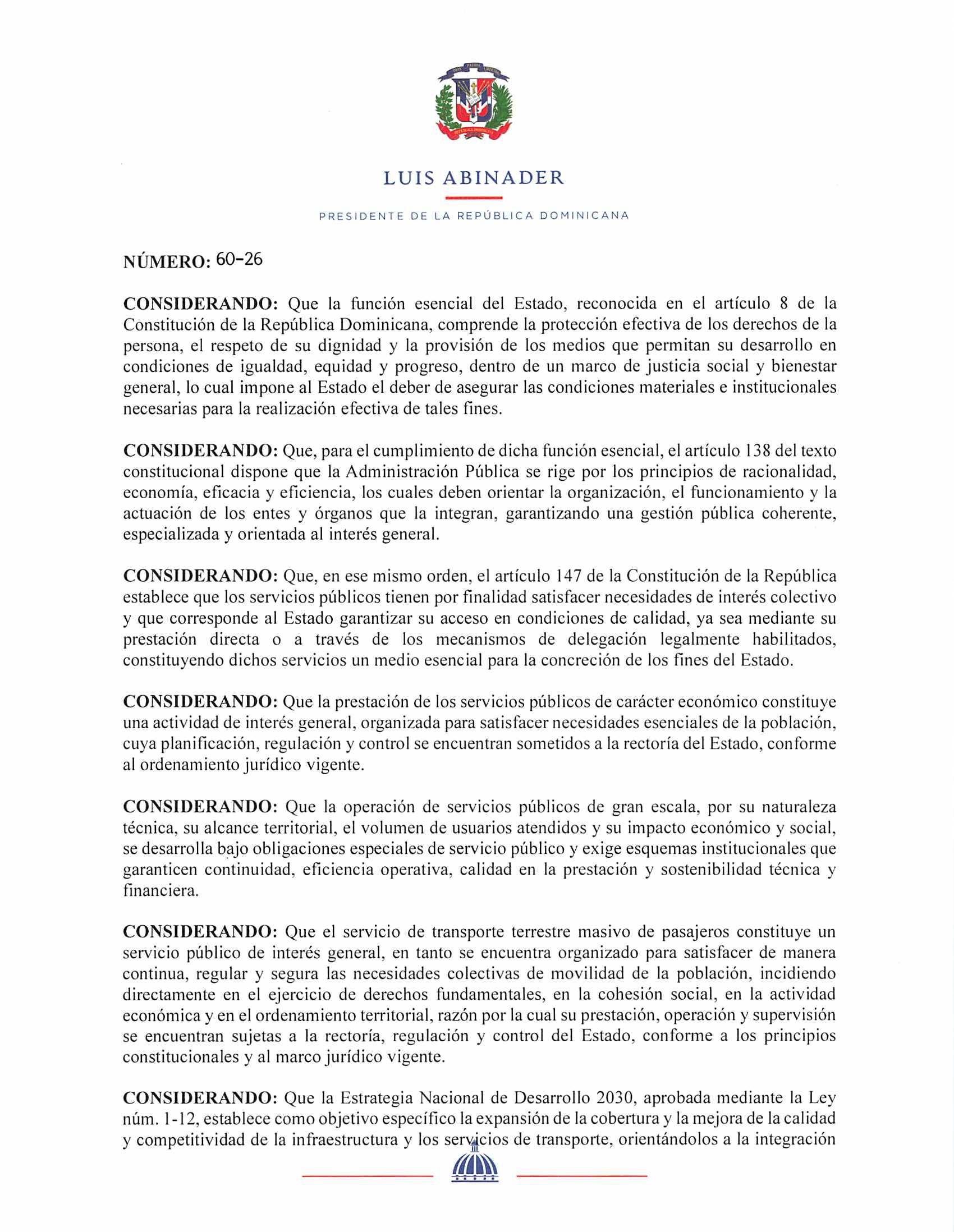 VISTO: El Decreto núm. 292-20, del 31 de julio de 2020, que establece el Reglamento del Servicio Público de Transporte Terrestre de Pasajeros Urbano.