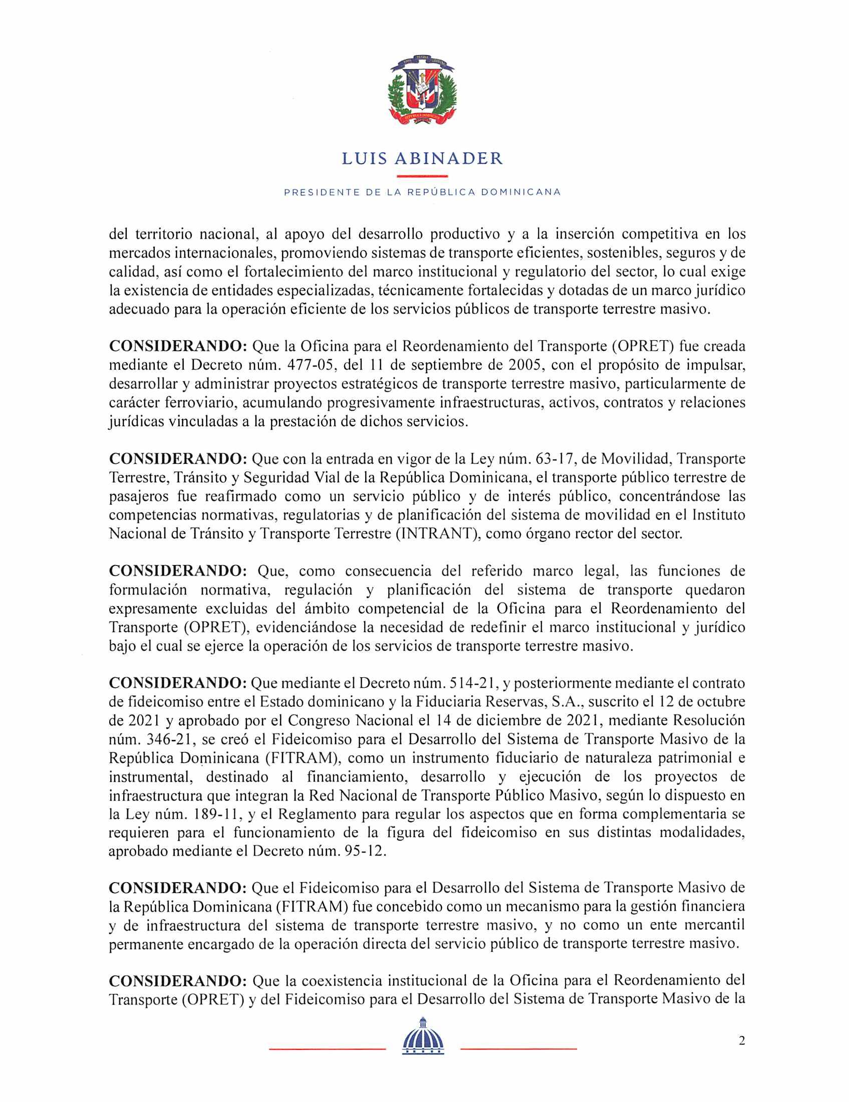 VISTO: El Decreto núm. 514-21, del 17 de agosto de 2021, que constituye el Fideicomiso para el Desarrollo del Sistema de Transporte Masivo de la República Dominicana (FITRAM).