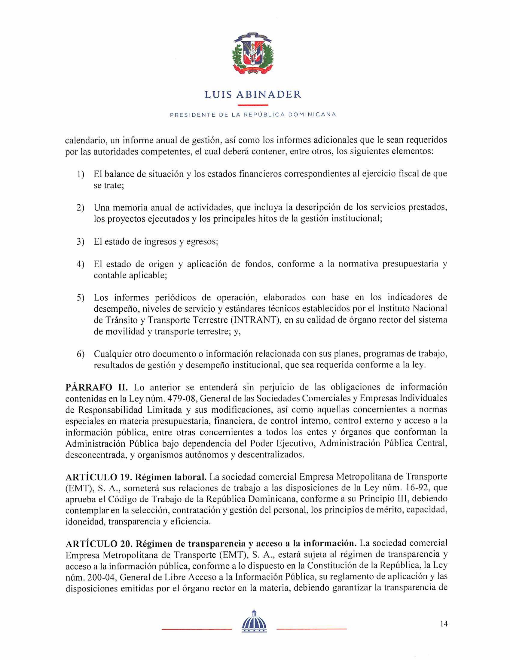 ARTÍCULO 19. Régimen laboral. La sociedad comercial Empresa Metropolitana de Transporte (EMT), S. A., someterá sus relaciones de trabajo a las disposiciones de la Ley núm. 16-92, que aprueba el Código de Trabajo de la República Dominicana, conforme a su Principio 111, debiendo contemplar en la selección, contratación y gestión del personal, los principios de mérito, capacidad, idoneidad, transparencia y eficiencia.