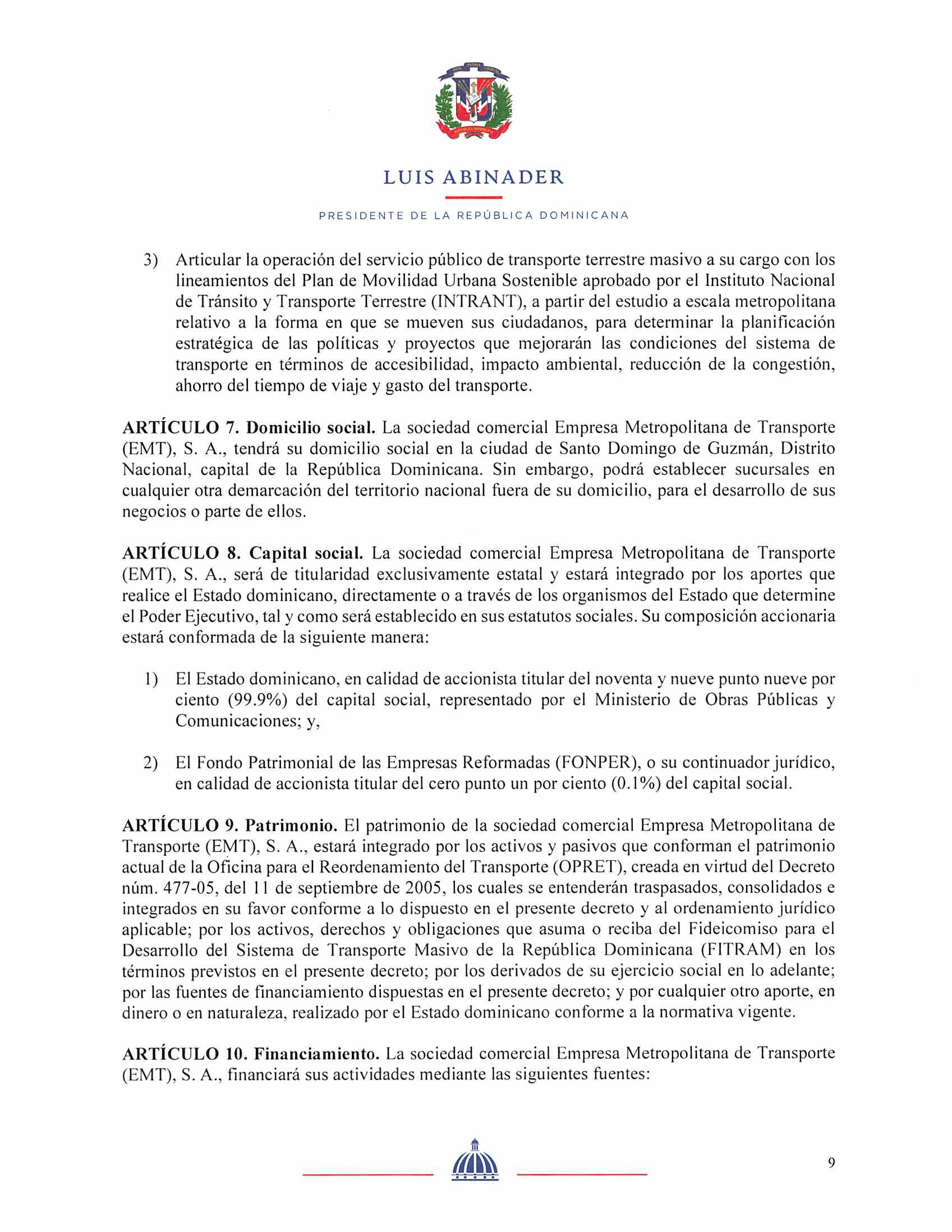 ARTÍCULO 9. Patrimonio. El patrimonio de la sociedad comercial Empresa Metropolitana de Transporte (EMT), S. A., estará integrado por los activos y pasivos que conforman el patrimonio actual de la Oficina para el Reordenamiento del Transporte (OPRET), creada en virtud del Decreto núm. 477-05, del 11 de septiembre de 2005, los cuales se entenderán traspasados, consolidados e integrados en su favor conforme a lo dispuesto en el presente decreto y al ordenamiento jurídico aplicable; por los activos, derechos y obligaciones que asuma o reciba del Fideicomiso para el Desarrollo del Sistema de Transporte Masivo de la República Dominicana (FITRAM) en los términos previstos en el presente decreto; por los derivados de su ejercicio social en lo adelante; por las fuentes de financiamiento dispuestas en el presente decreto; y por cualquier otro aporte, en dinero o en naturaleza, realizado por el Estado dominicano conforme a la normativa vigente.