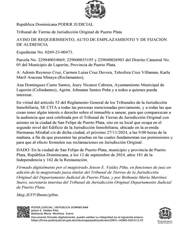 1ra. Sala Tribunal De Tierras De Jurisdicción Original De La Vega R.D. Auto de Fijación Audiencia no.245-2024 de fecha 11/07/2024 Expediente 2024-0067436 Aprobación técnica de la Dirección Reg. de Mensuras Catastrales Depto. Norte No. 6622019023764 de fecha 14/05/2019 sobre la mensura para DESLINDE del siguiente Inmueble: Provincia La Vega, Municipio La Vega DC/POS 314216581756 superficie 295.20m2 parcela 36, del DC 11, zona urbana, Villa Paraiso, ubicación: en la calle 4 del sector Villa Paraiso II se encuentra el inmueble. Solicitante: JOSE MANUEL SANTOS VARGAS Y LILIANA ALT. PORTORREAL TAVAREZ representados por la LICDA. VERONICA DAMARIS SANTOS DE GALVAN. Se citan a todos los colindantes, vendedores, personas que figuren inscritas en el registro complementario de dicho inmueble y demás interesados a la audiencia fijada para el día 11/11/2024 a las 09:00 a.m., a celebrarse en este tribunal sito en Ave. García Godoy #32 esq. calles Duvergé y Mons. Panal, 1er. nivel Palacio de Justicia, Sala 1, de la ciudad de La Vega. CRISTINA SOBEIDA GUTIERREZ NUÑEZ Jueza 1era. Sala Tribunal de Tierras J.O. La Vega (VDS-AC-35521-WP-END-2/2+)