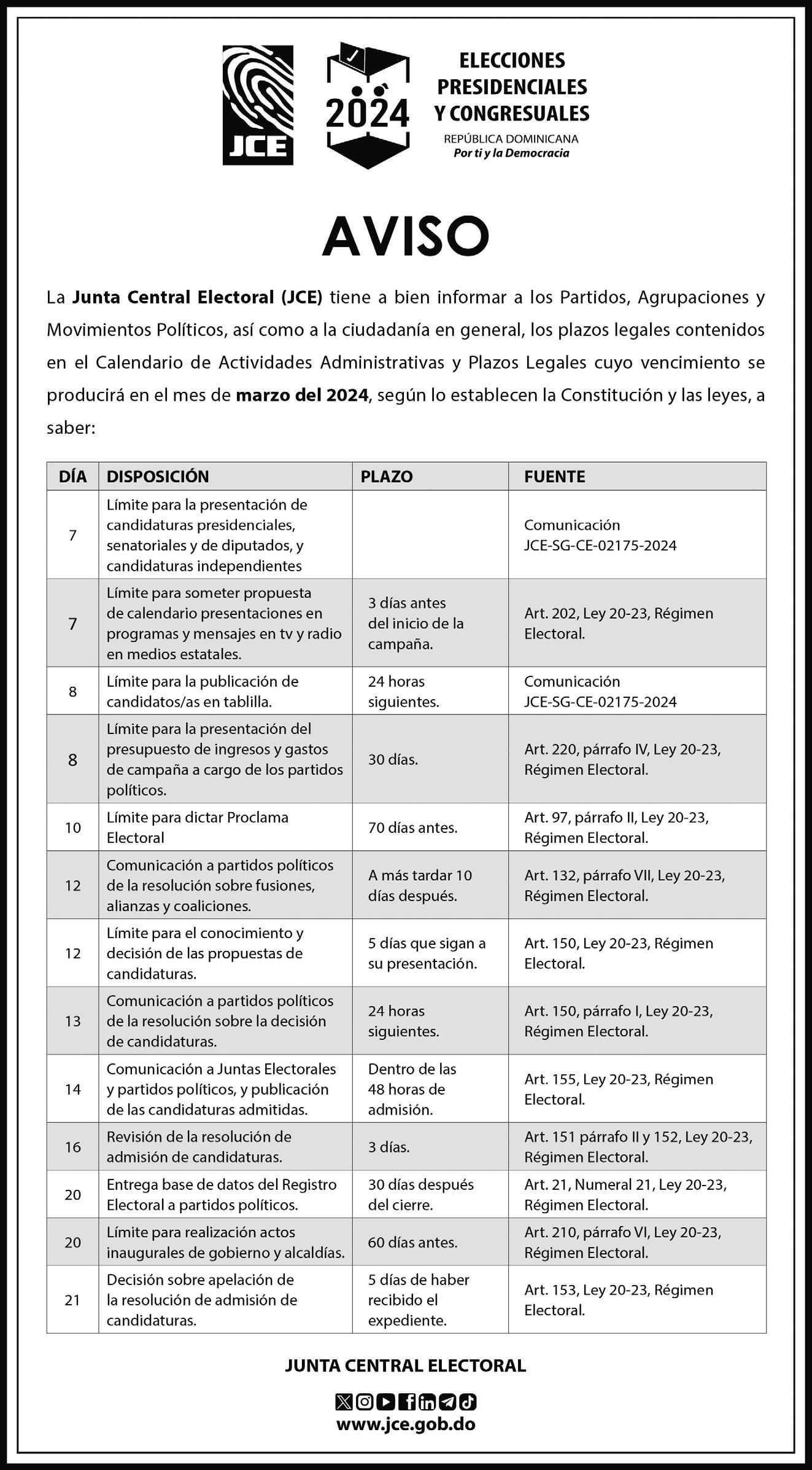 La Junta Central Electoral (JCE), aclaró ayer que no hay procesos de cedulación ni de declaración tardía para nuevos inscritos abiertos, tras recordar que el padrón de elecciones está cerrado hasta tanto concluya el proceso electoral del 19 mayo próximo. En ese sentido, la entidad de elecciones aclaró que no ha participado ni participa de ningún operativo de declaración tardía que se haya anunciado a realizarse durante este fin de semana P.02