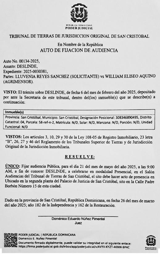 Ha sido pospuesta para el día miércoles que contaremos a Treinta (30) de abril del 2025, a las 9:00 A. M., ante la Quinta Sala de la Cámara Civil y Comercial del juzgado de Primera Instancia del Distrito Nacional, la cual celebra sus audiencias públicas en el Tercer Nivel del Palacio de Justicia (Edificio de las Cortes), entre las calles Hipólito Herrera Billini con Juan de Dios Ventura Simó del sector La Feria del Distrito Nacional, La venta en pública subasta del embargo Inmobiliario Abreviado de fecha de fecha 08-11-24 mediante el acto 1000-24, inscrito 27-11-24, en virtud del AUTO marcado con el Numero 1289-2024-SUT-00001 de fecha 15 de enero del año 2024, DADO POR LA QUINTA SALA DE LA CAMARA CIVIL Y COMECIAL DEL JUZGADO DE PRIMERA INSTANCIA DE AL PROVINCIA SANTO DOMINGO sobre el siguiente inmueble, MATRICULA 0100288823, 400432052975-B9 DE LA UNIDAD FUNCIONAL 89, CONDOMINIO TORRE REYBUB XII, BLOQUE 09 CON UNA EXTENSION SUPERFICIAL DE 108.00M2, UBICADO EN EL DISTRITO NACIONAL propiedad de ORLANDO VARGAS ALMONTE cedula 001-0227415-6, domiciliado calle A, numero7, esq. Calle H, sector Cuesta Hermosa III, Distrito Nacional Y SU ESPOSA BEATRIZ MONICA DUTSCH, A diligencia y persecución de DR. JULIO CABRERA BRITO, Abogado, Cedula 001-0127480-1, residente en el No. 07 Residencial la Gloria, Alcarrizos, Provincia Santo Domingo., abogado persiguiente Licda. DOMINGA DIAZ MENDEZ, matrícula 54323-173-14, domicilio No. 07 calle Primera, residencial La Gloria Los Alcarrizos, provincia Santo Domingo, Teléfono 809-763-5975, precio de la primera puja sobre el 50% del inmueble (RD$5,500,000.00), más los honorarios que resulten aprobados según el pliego de condiciones de fecha 08-01-25. Los licitadores deberán depositar el Diez por ciento 10% del precio de la primera puja ante la secretaria del tribunal. DR. JULIO CABRERA BRITO Abogado persiguiente