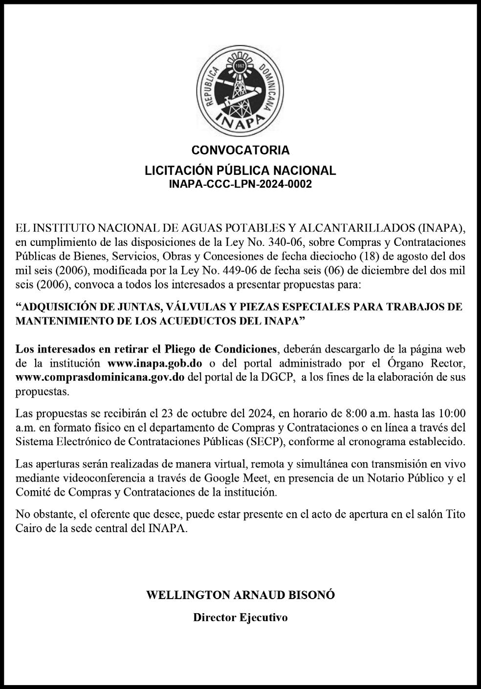 Quienes suscriben, DANIEL PINALES SAVIÑON, dominicano, mayor de edad, soltero, albañil, portador de la cédula de identidad y electoral No. 053-0001848-7, cuyo domicilio y en esta Ciudad de Santo Domingo, Distrito Nacional; PEDRO PINALES SAVIÑON, dominicano, mayor de edad, soltero, agricultor, portador de la cédula de identidad y electoral No. 053-0003495-5, cuyo domicilio y en esta Ciudad de Santo Domingo, Distrito Nacional; WANDY MANUEL PINALES MORONTA, dominicano, mayor de edad, soltero, portador de la cédula de identidad y electoral No. 053-0030308-7, cuyo domicilio y en esta Ciudad de Santo Domingo, Distrito Nacional, que en cumplimiento de las disposiciones contenidas en el artículo 92 párrafo 3 de la Ley No. 108-05 sobre Registro Inmobiliario y el art. 86 del Reglamento General de Registro de Títulos se hace de público conocimiento que la matricula No. 3000279584, que ampara los derechos sobre una porción de terreno con una extensión superficial de 23,168.09mts2, en el ámbito de la Parcela No. 1271-S, del Distrito Catastral No. 02, de Constanza, La Vega, que se ha extraviado, a los fines de obtener el DUPLICADO DEL DUEÑO expedido por el Registro de Títulos del Distrito Nacional, a nombre de mi fallecido padre TITO PINALES CARABALLO (FALLECIDO), y como únicos herederos de los mismos. En Santo Domingo, Distrito Nacional, a los 27 de agostos del 2024.