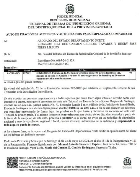 PUBLICACION PROCESO DESLINDE Y AVISO DE AUDIENCIA. De conformidad con el artículo 46 y siguientes, de la Resolución 787-2022, que establece el Reglamento General de los Tribunales de Jurisdicción Inmobiliaria, se hace de público conocimiento lo siguiente: Que se ha fijado para el día 25/09/2024, el conocimiento de la Audiencia de la solicitud de Deslinde dentro de la Parcela 86-A-1, del Distrito Catastral No. 20 del Municipio de Santiago de los Caballeros, resultante de la Posicional No. 311468969764, sobre una porción que mide 2,215.75 mt2, sitio de la Barranquita; limitado: Al Norte: Tomás Reyes y la Parcela 86-A-1 (Resto); Al Este: Calle; Al Sur: Urbanizadora Acevedo y Parcela 86-A-1 (Resto); y Al Oeste: Urbanizadora Acevedo y Parcela 86-A-1 (Resto), el cual se encuentra ubicada entrando por la calle El Motocros, a una distancia de 837 metros al Oeste de la intersección formada por las avenidas Olímpica y la Yapur Dumit, y a 314 metros, de la calle El Motocros, de esta ciudad de Santiago de los Caballeros, correspondiente al expediente No. 0495-22-01397, del cual se encuentra apoderado la 1ra. Sala del Tribunal de Tierras de Jurisdicción Original de Santiago, ubicado en la calle Lic. Ramón García No. 77, Ensanche Román I, en el edificio de la Jurisdicción Inmobiliaria. Dicho Deslinde ha sido solicitado por el señor Ramón Antonio Reyes Reyes, dominicano, mayor de edad, soltero, cédula No. 031-0251843-2, domiciliado y residente en esta ciudad de Santiago de los Caballeros. LIC. LUPO R. DIAZ REYES, Abogado. Céd: 031-0046443-1. Tel. 809-757-8893.
